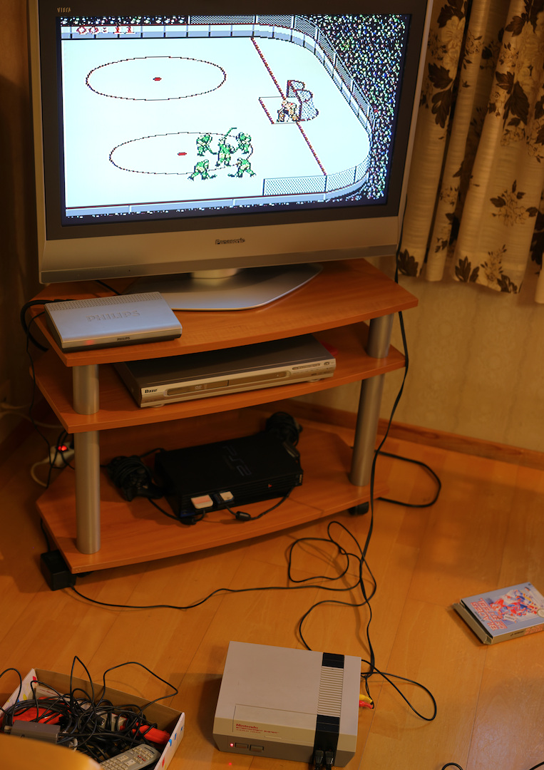 Wife’s old Nintendo was still in working condition when we visited her old home. We had some ice hockey match with wife’s relatives. Players cropped away form this version.