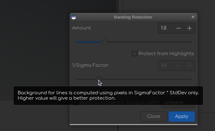 I’m confused a bit by a discrepancy between the name of a slider in the “Banding Reduction” dialog window and the description in the tooltip of this slider. The name of the slider says, “1/Sigma Factor”. However, the tooltip says, “Background for lines is computed using pixels in SigmaFactor * StdDev only” (screenshot of the dialog from Siril 1.2-beta2) attached). Am I understanding correctly that this slider defines the strength of highlight protection and it is computed by multiplication of the slider value by standard deviation of the image?