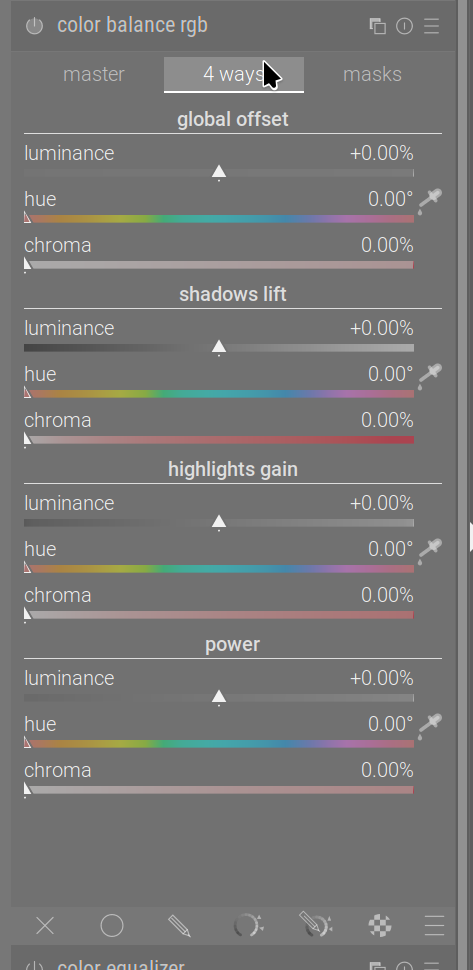 While doing that, notice that there will be an issue with customizing the sliders. The Agx primary sliders seems was designed similar to the primary modules. Unlike the sliders in the Color Balance RGB 4-way section where their position is only defined by the location of the triangular marker and not also a white bar along the sliders. So when I try to change the color for the sliders where there is no underlaying color to something other that white the sliders will look confusing in the primary and Agx primary modules. Except in the color balance RGB 4 way section where there is no bar in the sliders and thus no issue with introducing new color for the sliders.