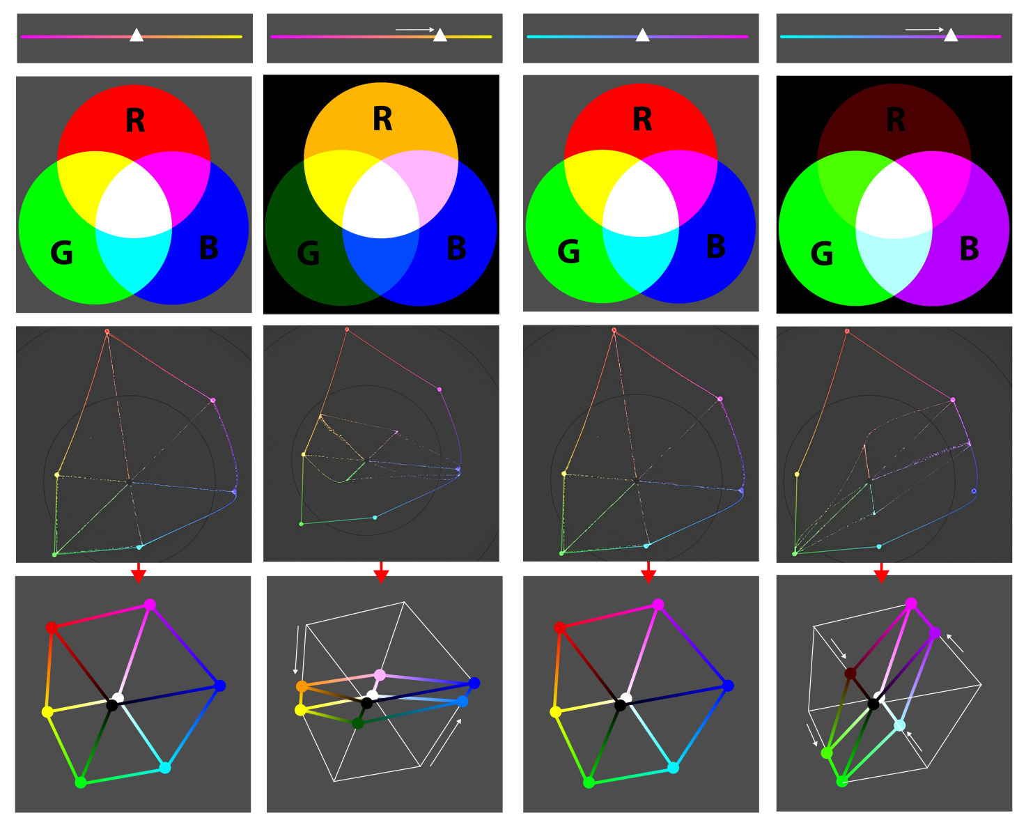 In the vectroscope the black point obscures diagonally opposite white point. That’s why I shifted the black point slightly in the graphic representation of the cube so that you can also see the white point opposite it.
