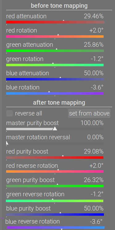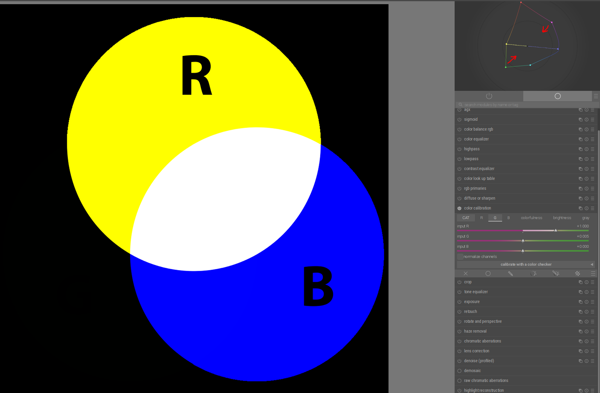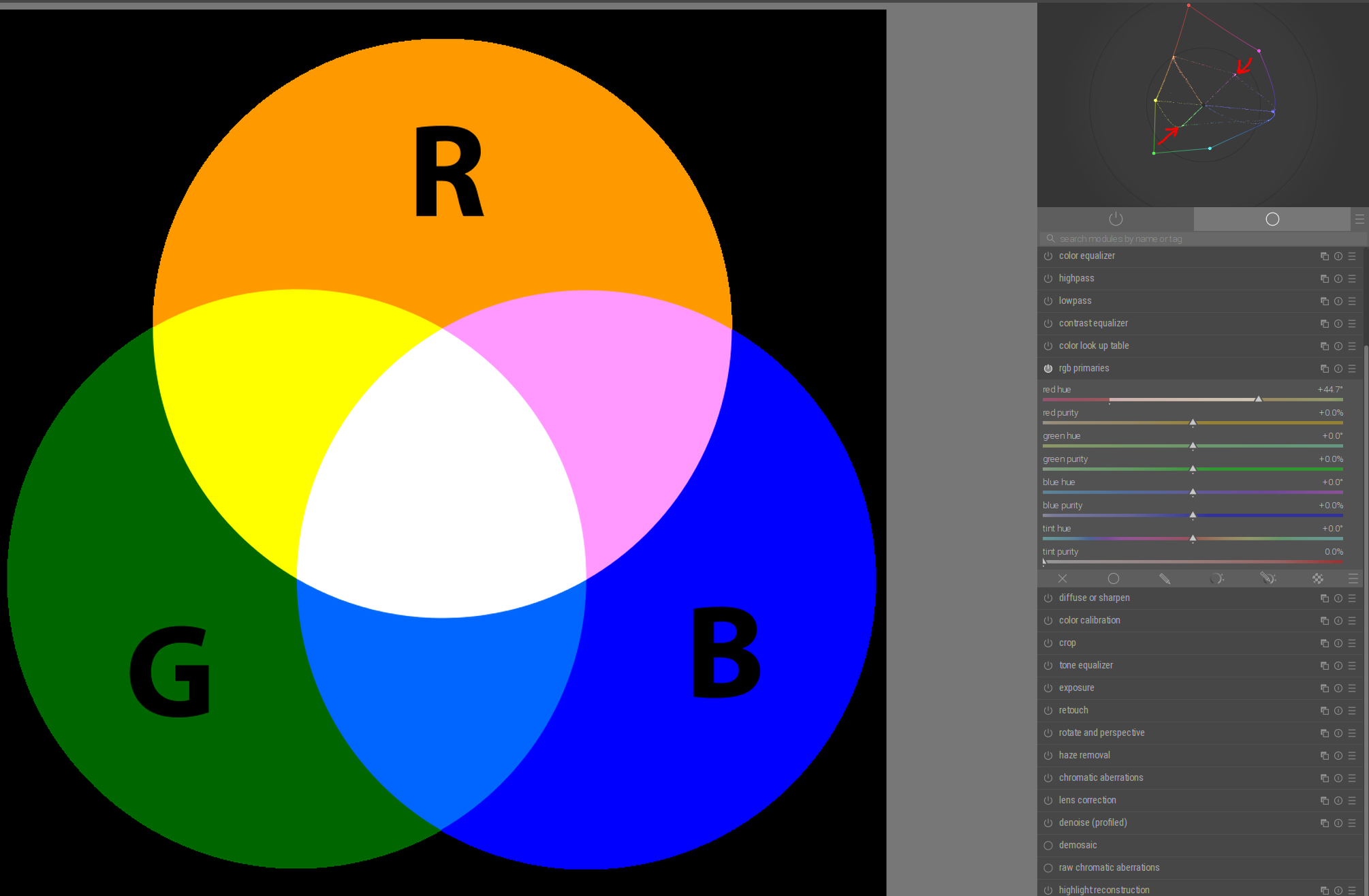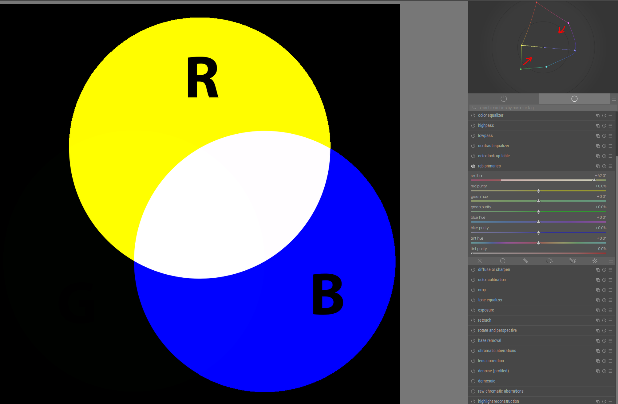Below, the red, green and blue dots represent the rotated primaries. They reflect the hue, but not the luminance. This will be important in the case of our poor green primary.