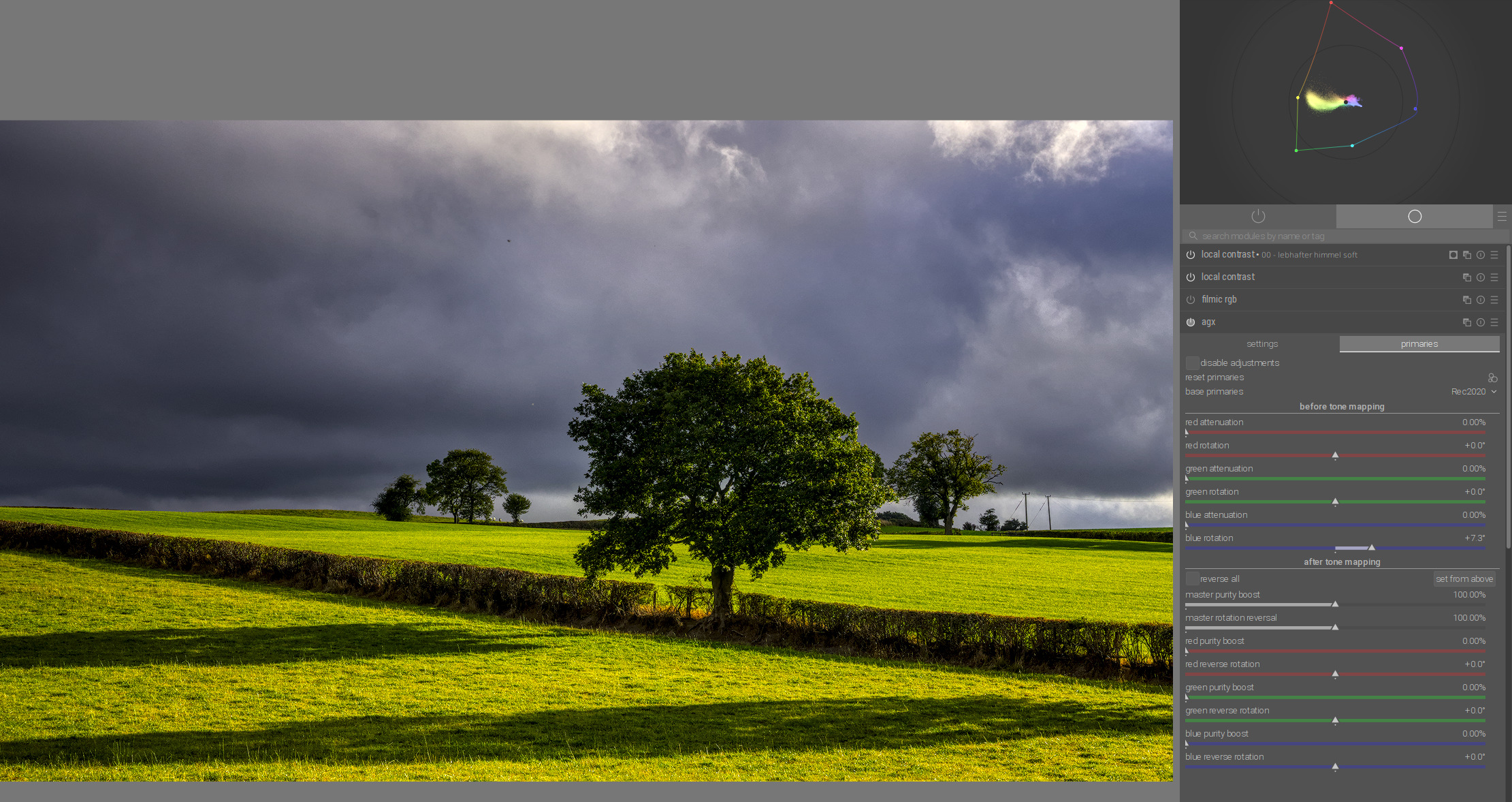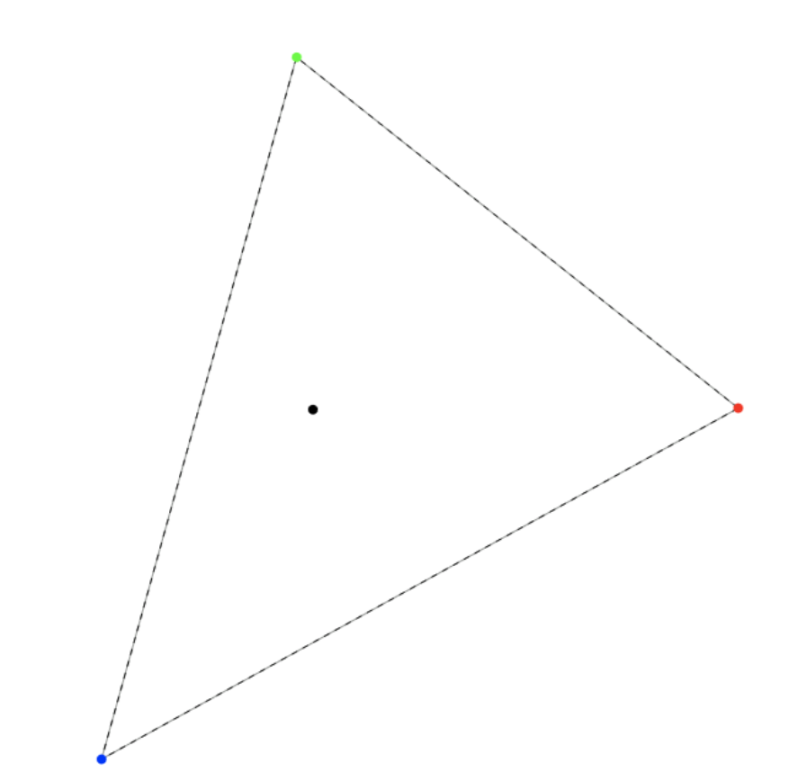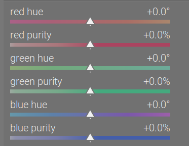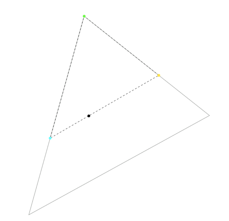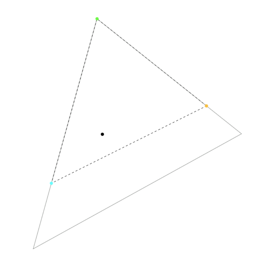 Below, the red, green and blue dots represent the rotated primaries. They reflect the hue, but not the luminance. This will be important in the case of our poor green primary.
