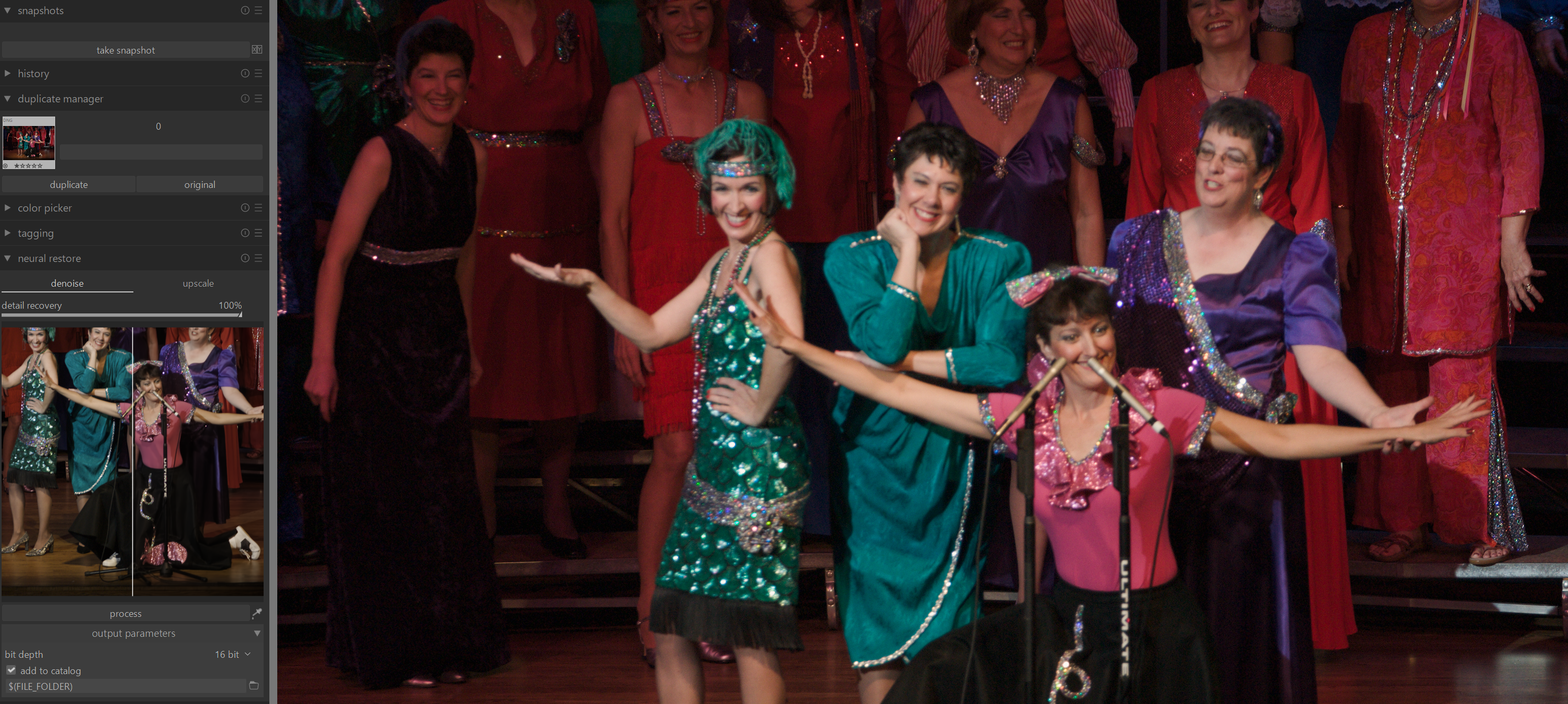 The denoised image is now imported into darktable and grouped with the original image