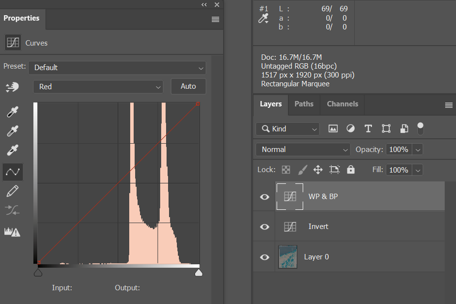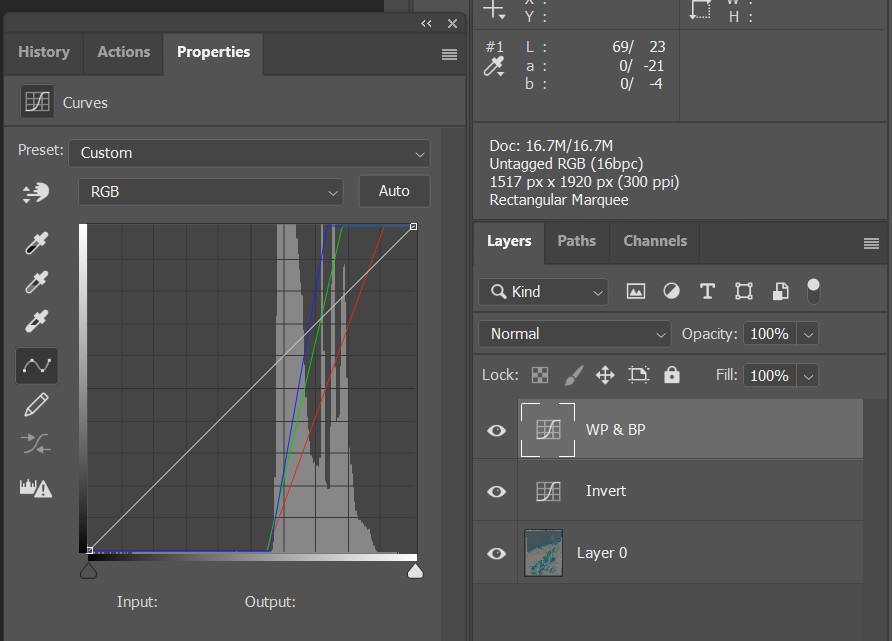 Here is what we should have. The channels are now stretched so that the dynamic range is expanded. Note that not every image should be expanded to the edges of the histogram. A foggy scene for example may not have any black or white in it. Such scenario can be addressed by e.g. moving the same Curves layer’s RGB (combined channel) control points vertically.