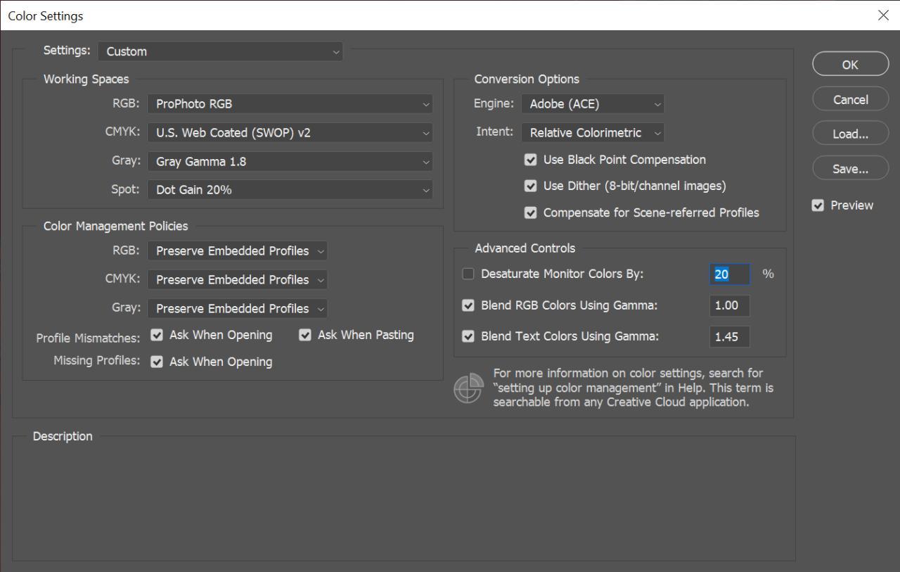 Setting ‘working space’ in Photoshop is always a big no-no to me. It doesn’t really do that much if your files are tagged with a working space, and it seems to confuse people who tend to think it yields better results.