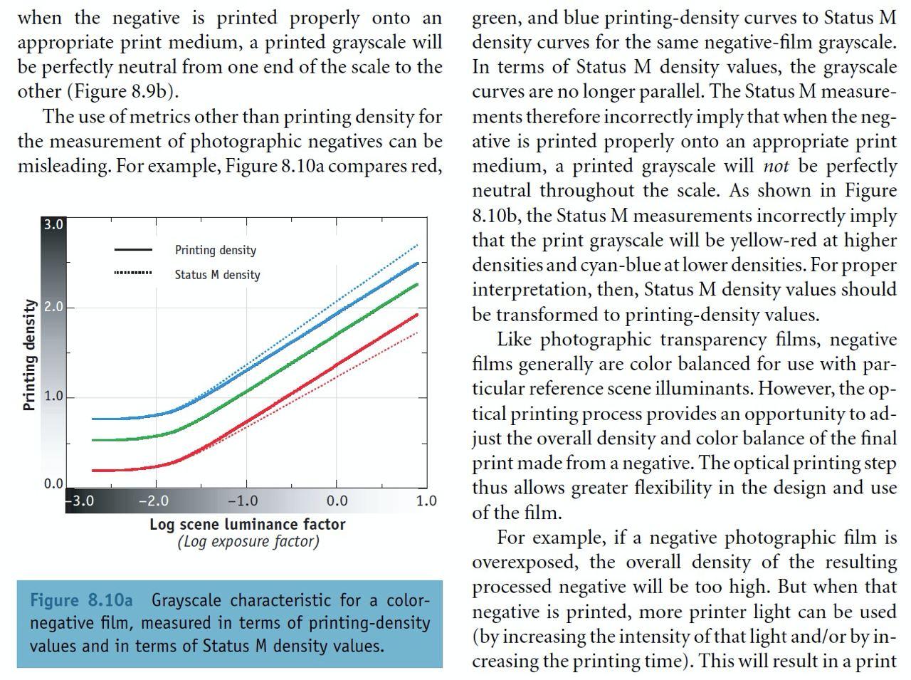 One such discrepancy which I still don’t have a solid understanding of is the behaviour of the orange mask. It is described as a dynamic system, producing a decreasing proportion of the orange mask color with increasing exposure. The cyan layer is the topmost and is placed above the mask, so the red channel response is unaffected by this behaviour. The green and blue channels each do gain extra input from the couplers, increasing with the exposure. As far as I understand, in practice this means a dark green patch on the negative would have more yellow in it (coming from the unreacted coupler) than a light green one of the same (exposure spectrum) hue, and similar for the blue channel. This should place the green and blue curves at an angle to the red one, but it doesn’t on the Figure 2 chart, so it is not quite completely clear. Here is an excerpt from Rogers, D. (2006). The Chemistry of Photography, 109-115.