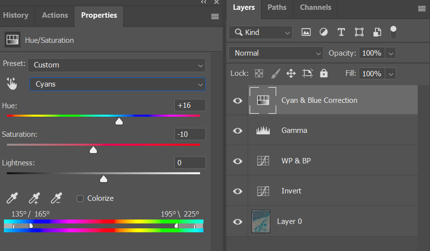Add another Hue/Adjustment layer (or use the same if you want) and this time select Blues in the options. Set the Hue to +11. Note the rocks in the shadows change the color. Notably, this deep blue color is not printable at all. It can be displayed on screen, but is way beyond the paper gamut. For this reason its saturation needs to be reduced even more, -20 should do it.