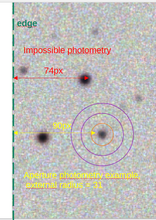 I have noticed that at less than 75 pixels (approximately), photometry becomes inapplicable (my outer radius = 31 pixels): is this due to incorrect handling on my part or is it a precautionary measure (which is not applied in VPHOT, I have checked).