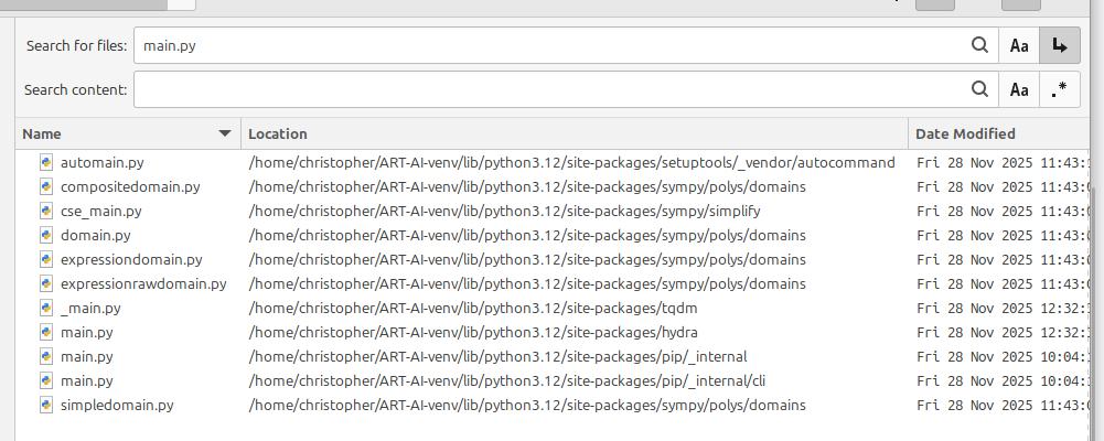 I have searched in the /home/christopher/ART-AI-venv directory for main.py, and found three files of that name (and some others whose names contain main.py), as shown below.