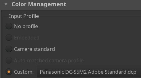For Panasonic Panasonic DC-S5M2, “Panasonic DC-S5M2 Camera Standard.dcp” is appropriate. Camera-specific DCP profiles also include Panasonic’s “Photo Style” emulation profiles.