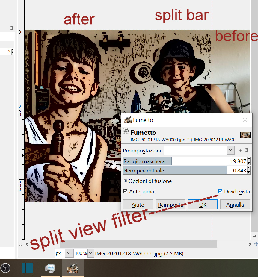 In many softwares you can display a vertical line wich splits the image in two parts: (left edited - right unedited). You can therefore move this vertical bar to compare the different part of the image just edited. E.g. with GIMP this “split view option” is available with the filters and it allows to preview the final result.
