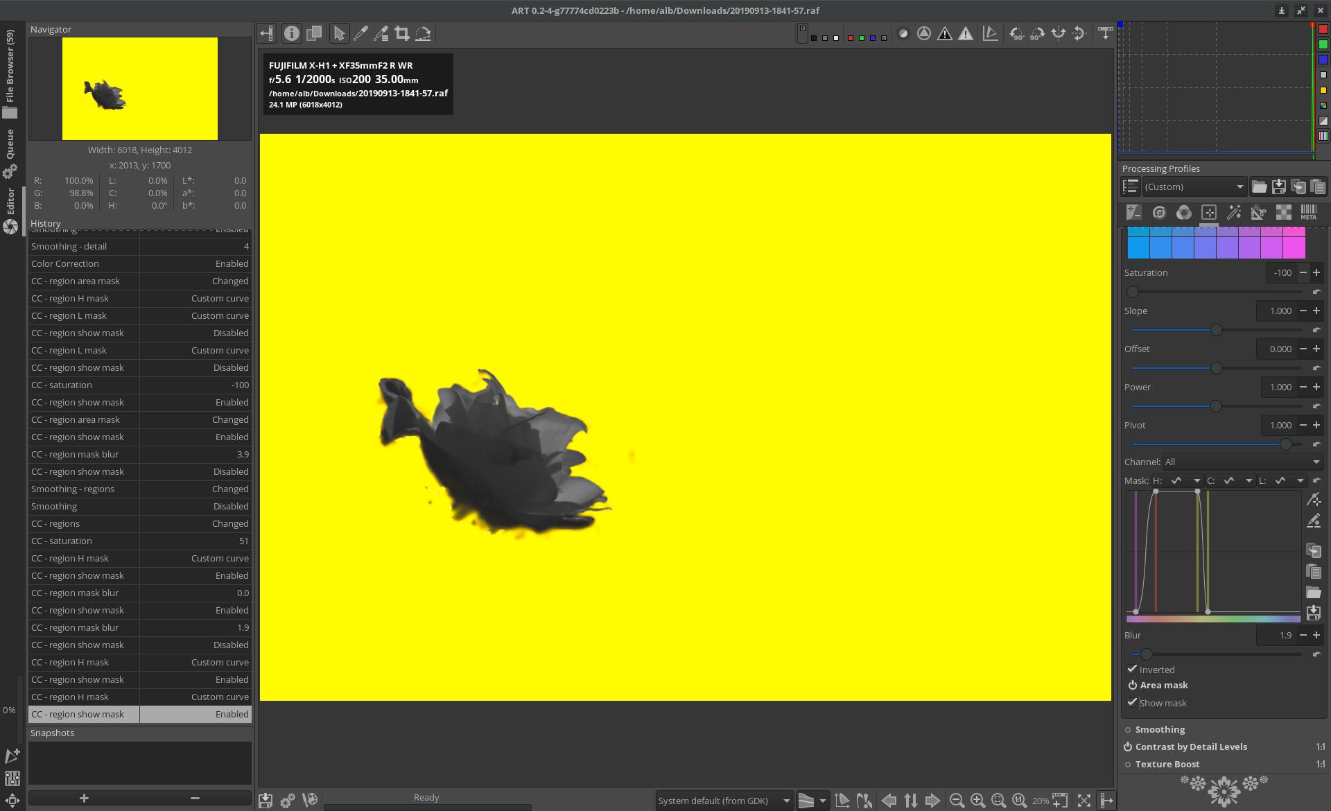I added 2 area masks: the first one over the hole image, and a second one just on the flower, in exclusion mode. For the main mask control I created a dip in the hue corresponding to the flower, and for the area mask I played with feather and contrast curve.