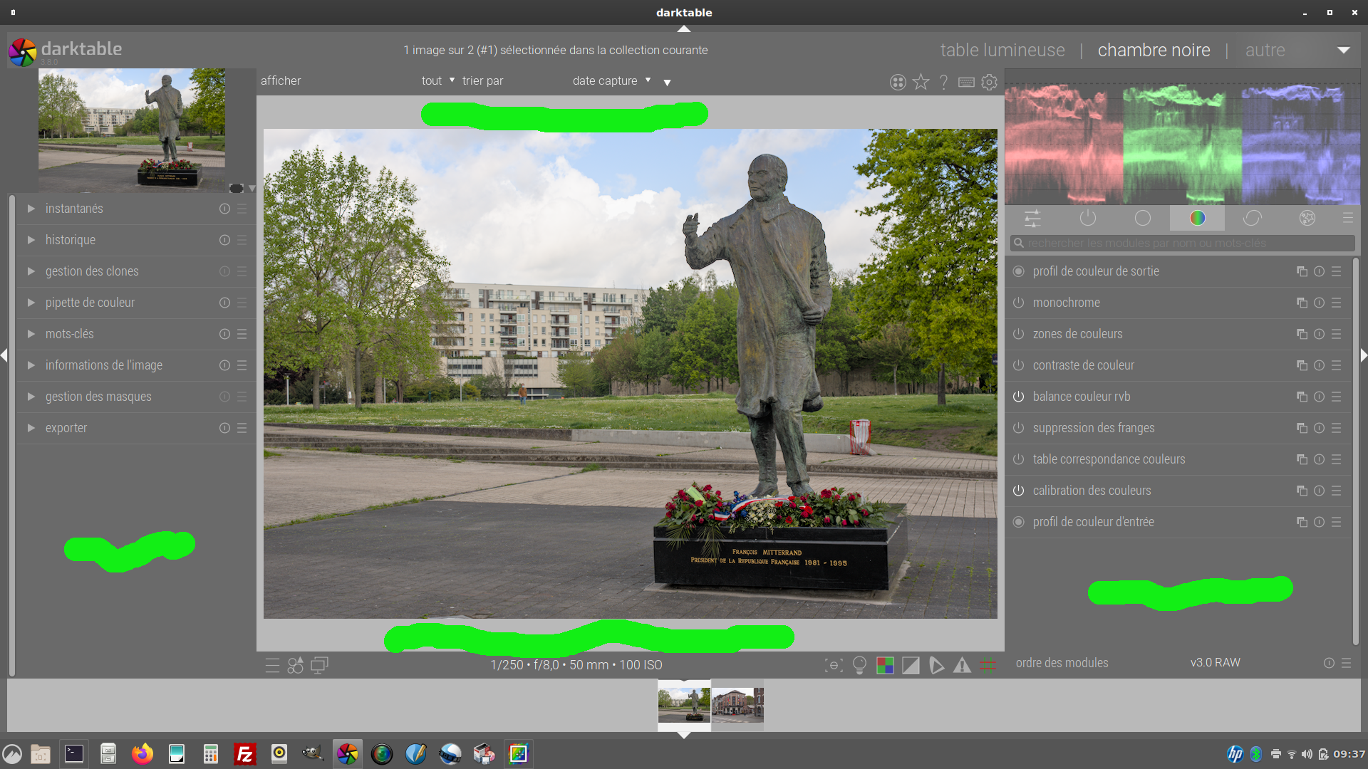 English. Just another trick. The colors choosen for background, etc. are stored in Art’s options file, to be found in .config/ART/options. With the help of a color picker one can fine-tune these values.