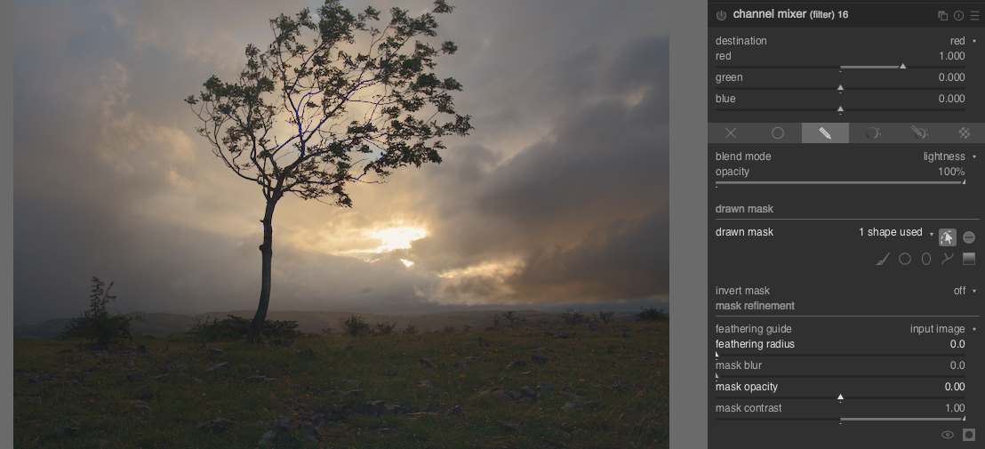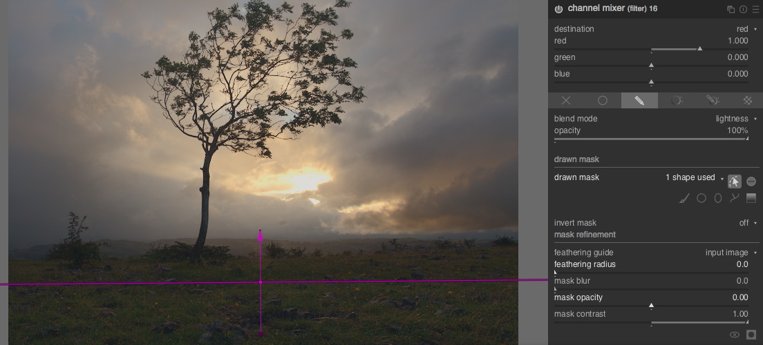 Nice pic! I have a screenshot from my work in progress. In darktable, I assume the top dotted purple line is the point at which the mask transition ends. Can anyone tell me how to bring that line closer to the centre point? I want a gradient mask that affects the foreground and not the highlight in the sky. The current mask in this screenshot doesn’t achieve that. I should be able to drag it down to right about where the tip of the arrow is now. Is that possible?