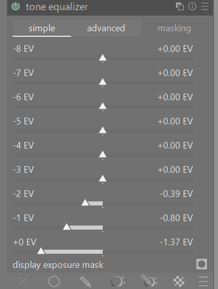With over exposed images where I am trying to use tone equalizer to recover highlights as much as possible I tend to use the simple sliders in this fashion, being careful of strange artefacts appearing. I have no problems brightening or darkening the midtones and shadows but the highlights require special care.