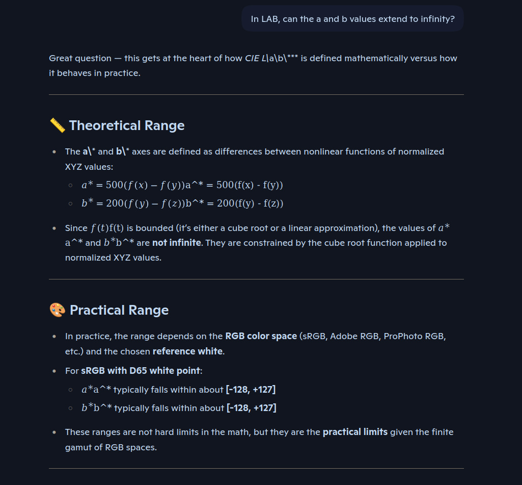 @martinus , is == C notation, I can’t remember, but I understand the graph of y=x! So to the more interesting point of whether a and b in Lab involve infinity. I asked MS Copilot and it says not! Have a look -
