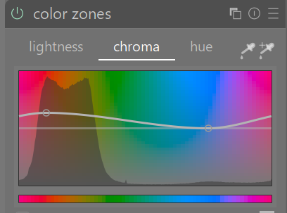 I wanted to give this a bit more effort (‘yellower’ yellow leaves and more pure red leaves and different overall colour balance), so I’ve gone in with the colour picker and rgb curve and colour zones. colour picker is getting up to 255 red in DT, but I think the downsampling on export to jpeg has lowered those a little.