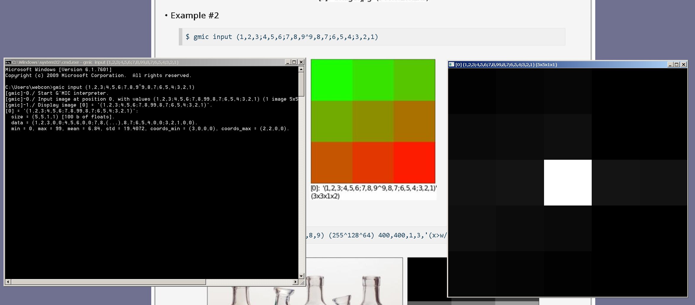 I was just playing around with G’MIC commands and was on the page at https://gmic.eu/reference/input.html If you look at example 2 on that page it has a command and what I take to be the image the command is supposed to create. However, my output looks nothing like the example image. Attached is a screenshot showing the page, the DOS window and G’MIC command and the output. Is this just a case of a doc error or am I missing something? Thanks.