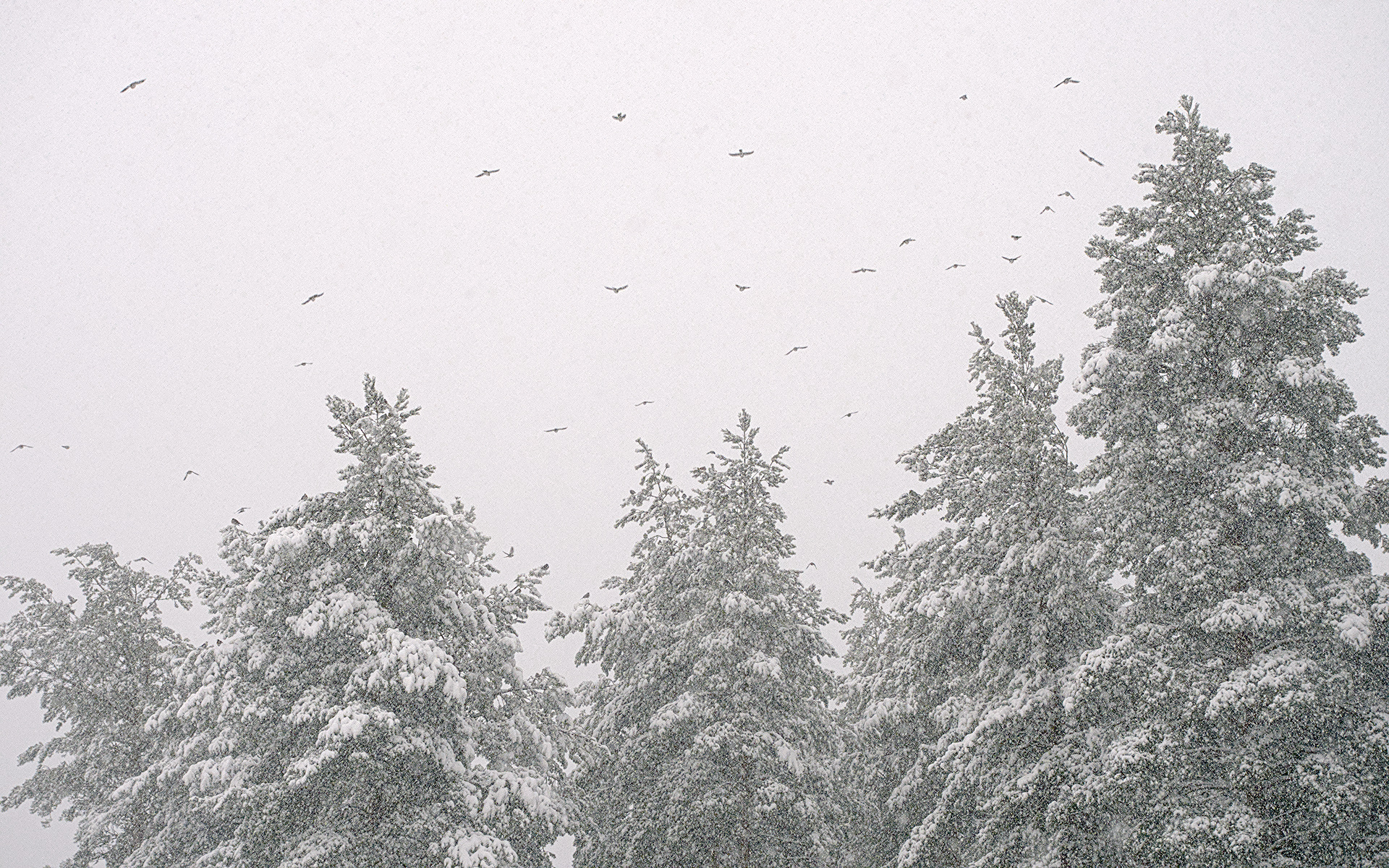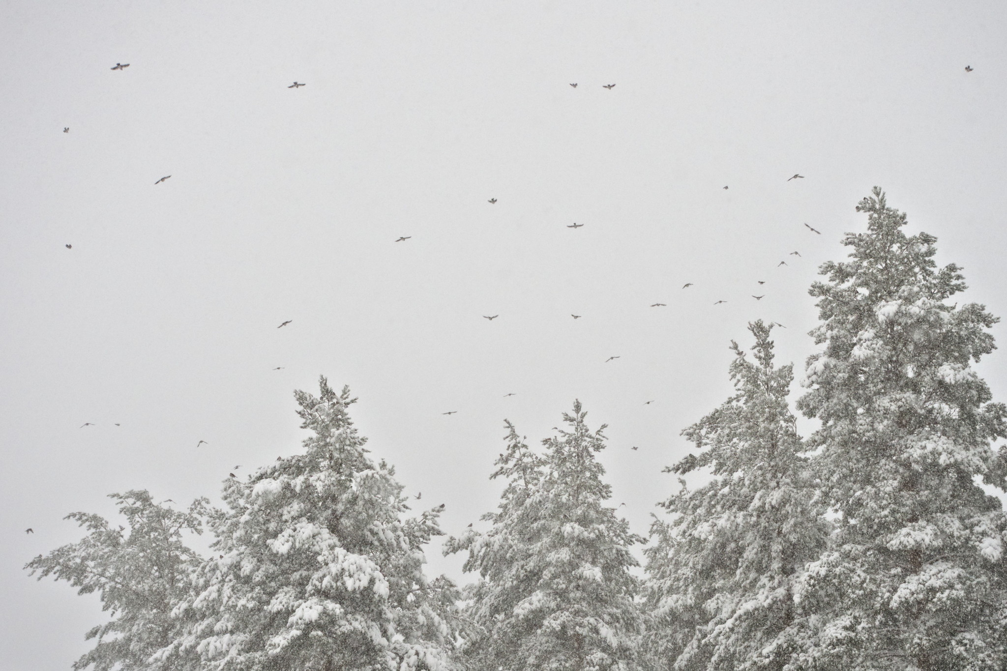Yesterday it was snowing, a lot. There have recently been big flocks of birds flying near our house in the treetops. I saw the birds once again and had to go out to capture a flight of them. Sometimes I feel a bit of a lucky bastard to have all this nature so near.