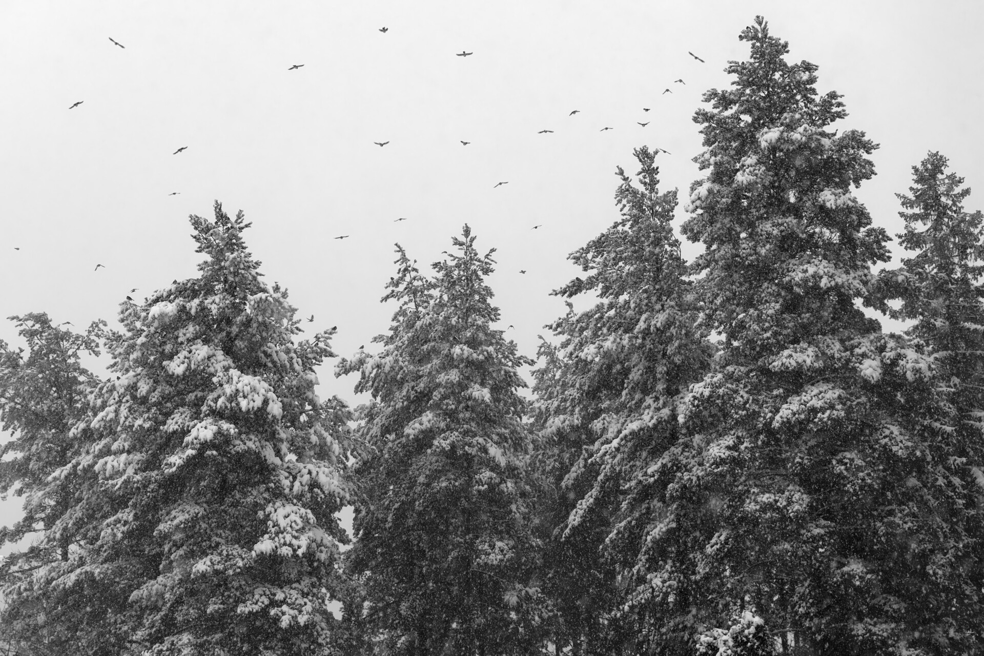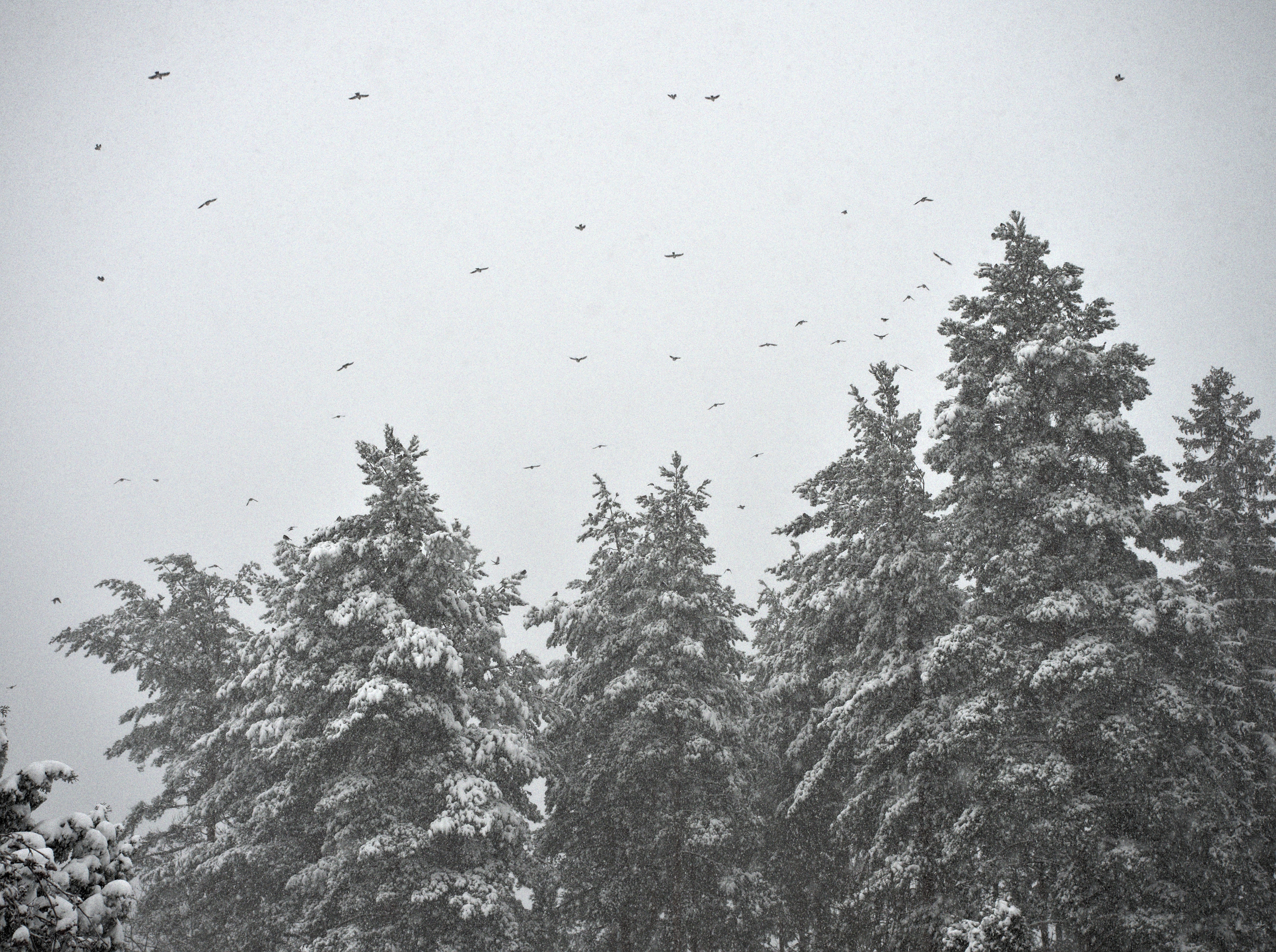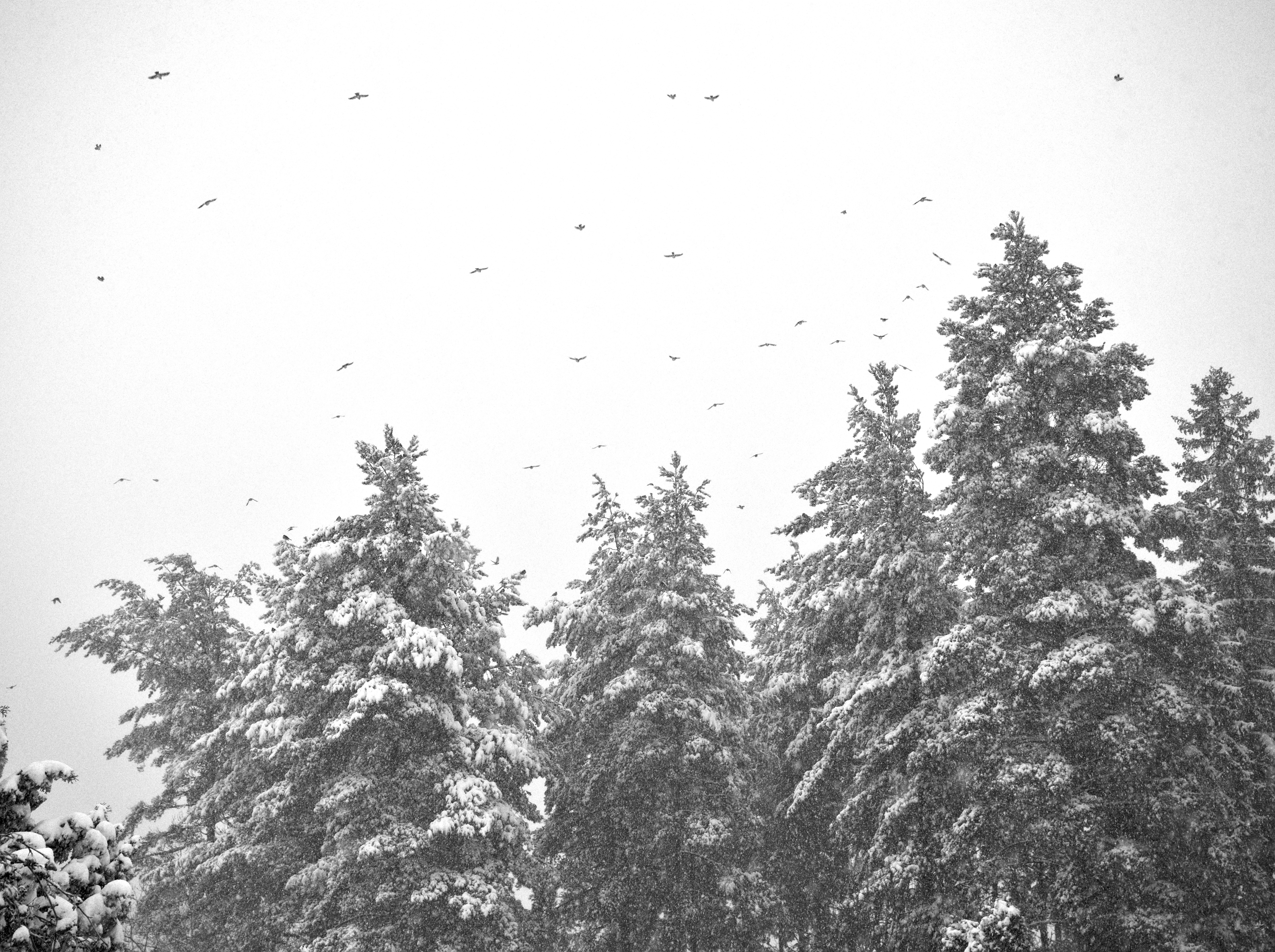 Here are a couple of edits of mine, a colourful and a B&W one. I used one instance of “diffuse or sharpen” to accentuate the bigger structure of the nearest trees and another one to sharpen the snowflakes and the birds.