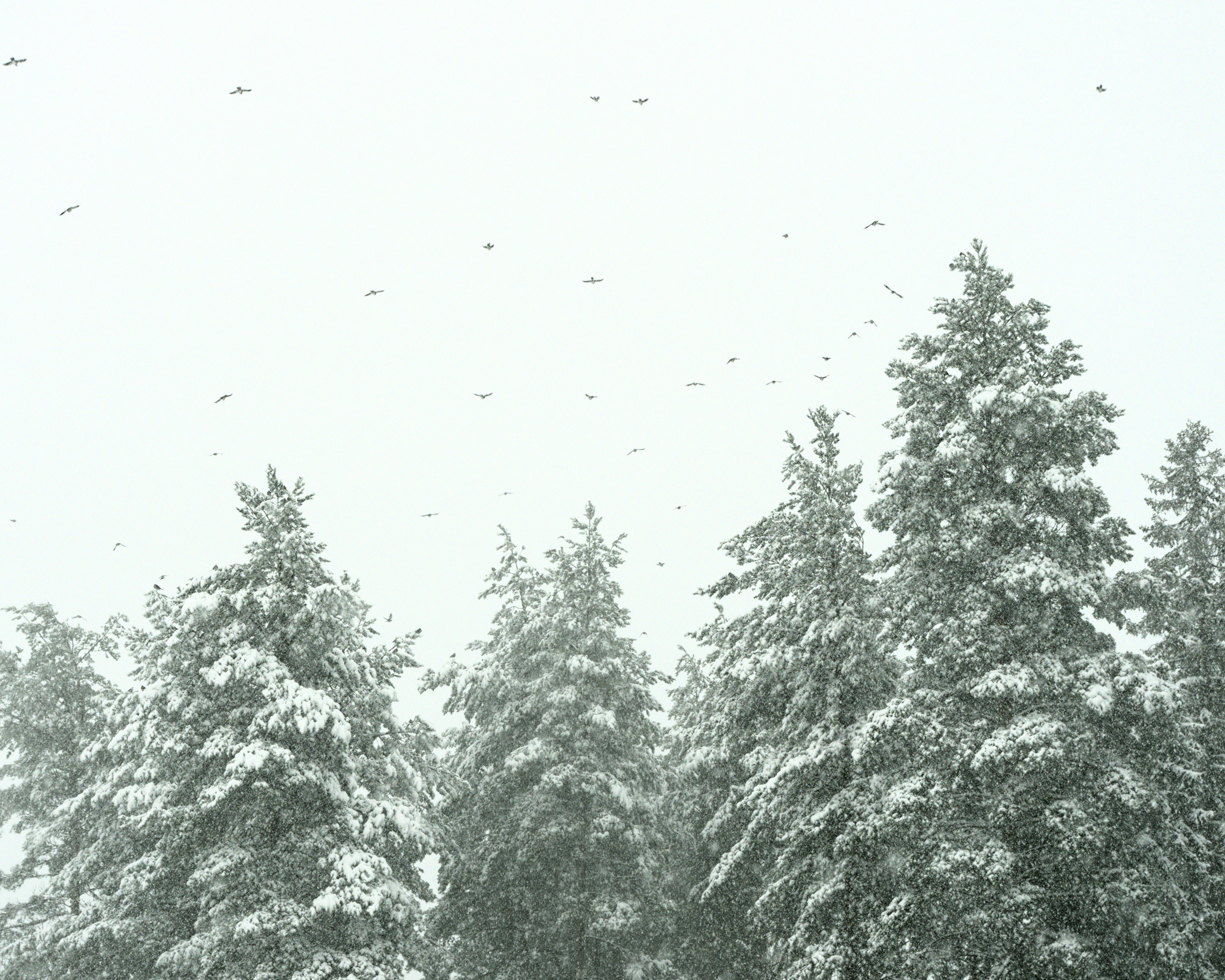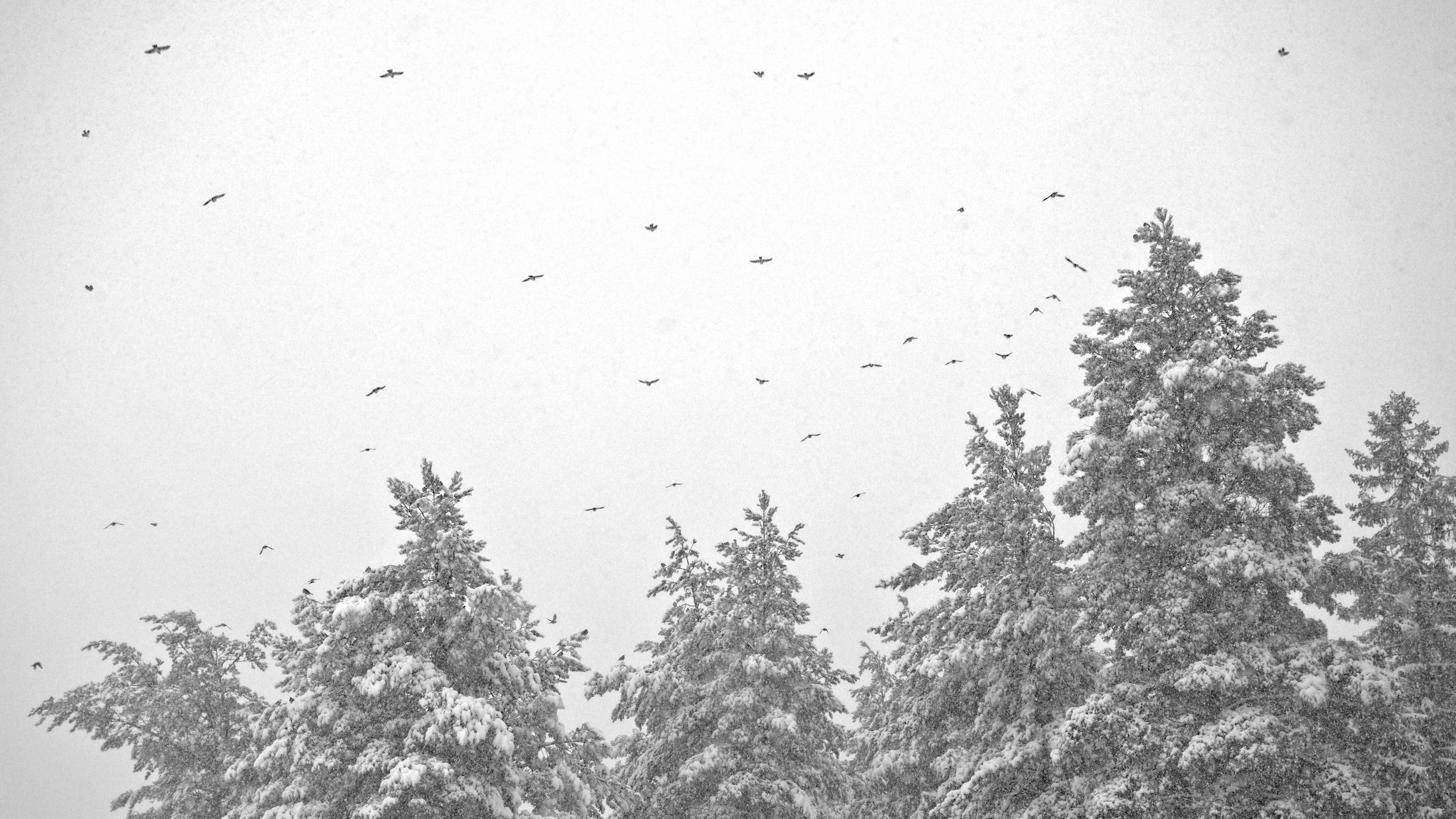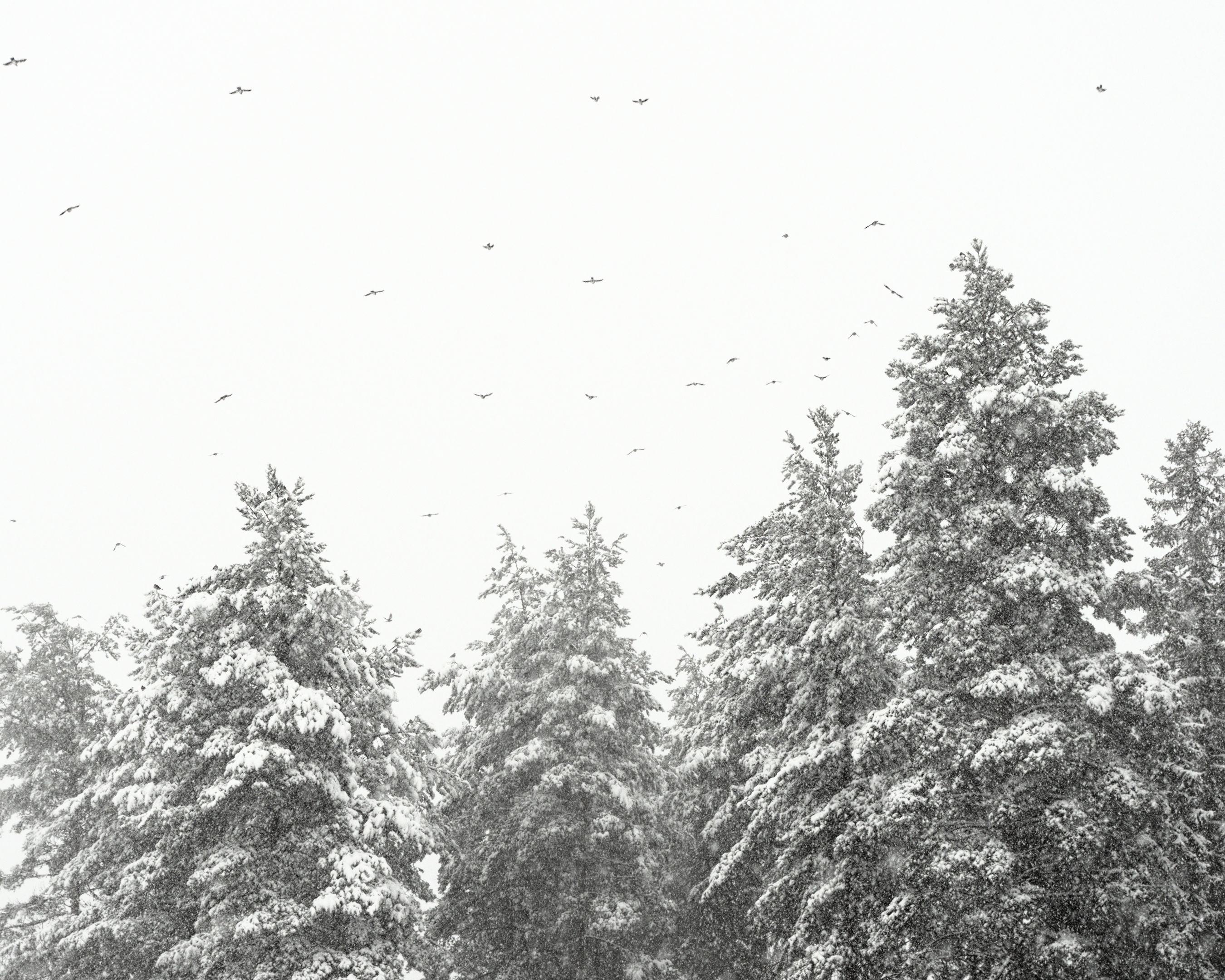 Here are a couple of edits of mine, a colourful and a B&W one. I used one instance of “diffuse or sharpen” to accentuate the bigger structure of the nearest trees and another one to sharpen the snowflakes and the birds.