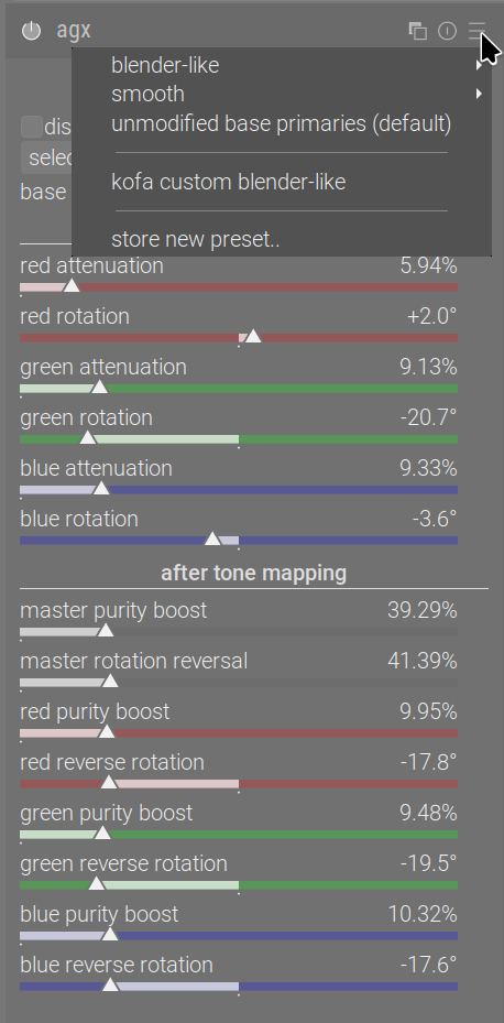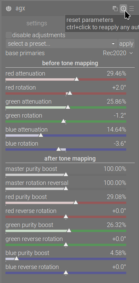 In your code you have the unmodified values as the defaults so I would guess the reset is always going to give those as it is. Then there was code that if agx was the workflow to use the modified primaries… Is this necessary…should the defaults for the module not just be determined and applied by default…And of course there is a preset to get to unmodified primaries???