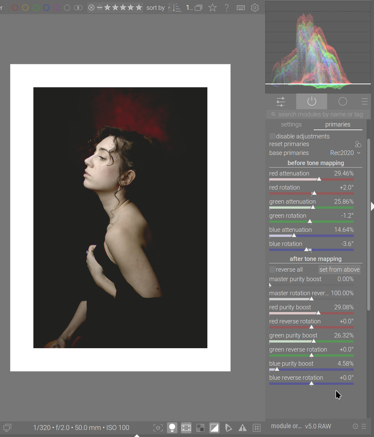 This is the lovely lady whose photo we’ve used a few times. I just opened the photo in darktable, and what we see is the default (exposure module’s scene-referred default +0.7 EV boost + agx also with the scene-referred default preset – the image would more exposure boost, but for the sake of this experiment, let’s leave it as it is). We get hardly any gamut warnings (there are a few red spots). The waveform is slightly above black.
