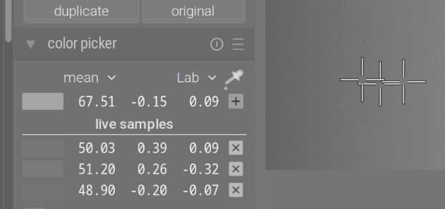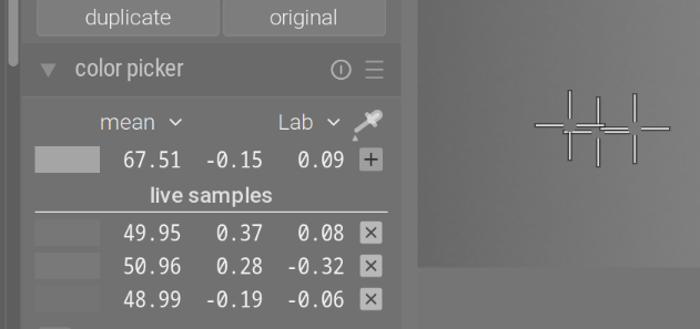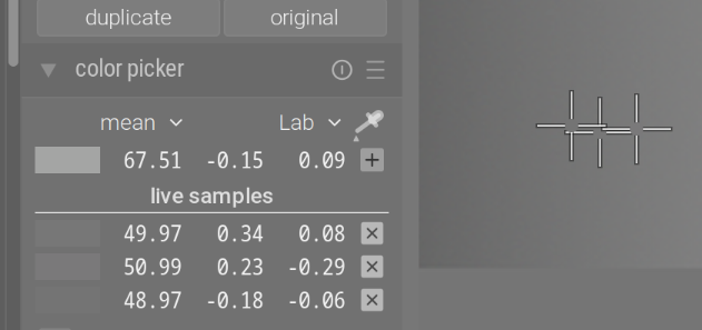 I’ve added 3 pickers to a grey ramp. I’ll show Lab values, and Lab is not linear, but as long as contrast is 1, we expect those values not to change significantly.