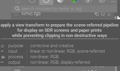Yes, it’s correct. I have no idea what those are actually meant to convey. Once you apply a curve to linear data, it’s not linear. Its encoding may be linear (no ‘gamma’ is applied, for example). I don’t know which sense ‘linear’ in the output specification is supposed to express: the encoding or the data itself. Since whether the data is linear or not depends on the preceding modules (e.g. if you apply tone equalizer, the data is no longer linear, but its encoding is), I don’t think it makes sense to say the output of any module is guaranteed to be linear (maybe up to input color profile it can be guaranteed), so it could only mean the encoding; but then, until output color profile, all of them are in linear encoding, so it makes no sense to specify that. To make things even more confusing, some modules use ‘quasi-linear’ to describe the process and the output (sharpen, tone equalizer, color equalizer). ![]()