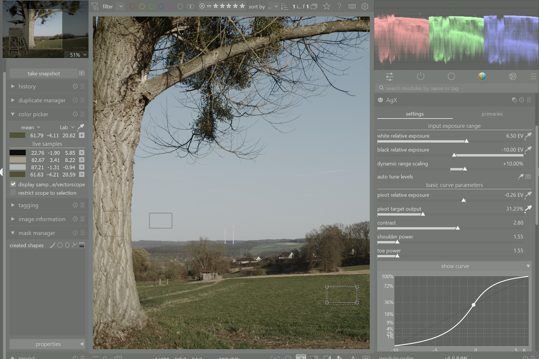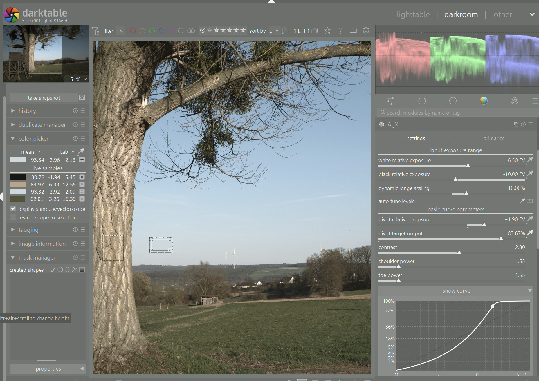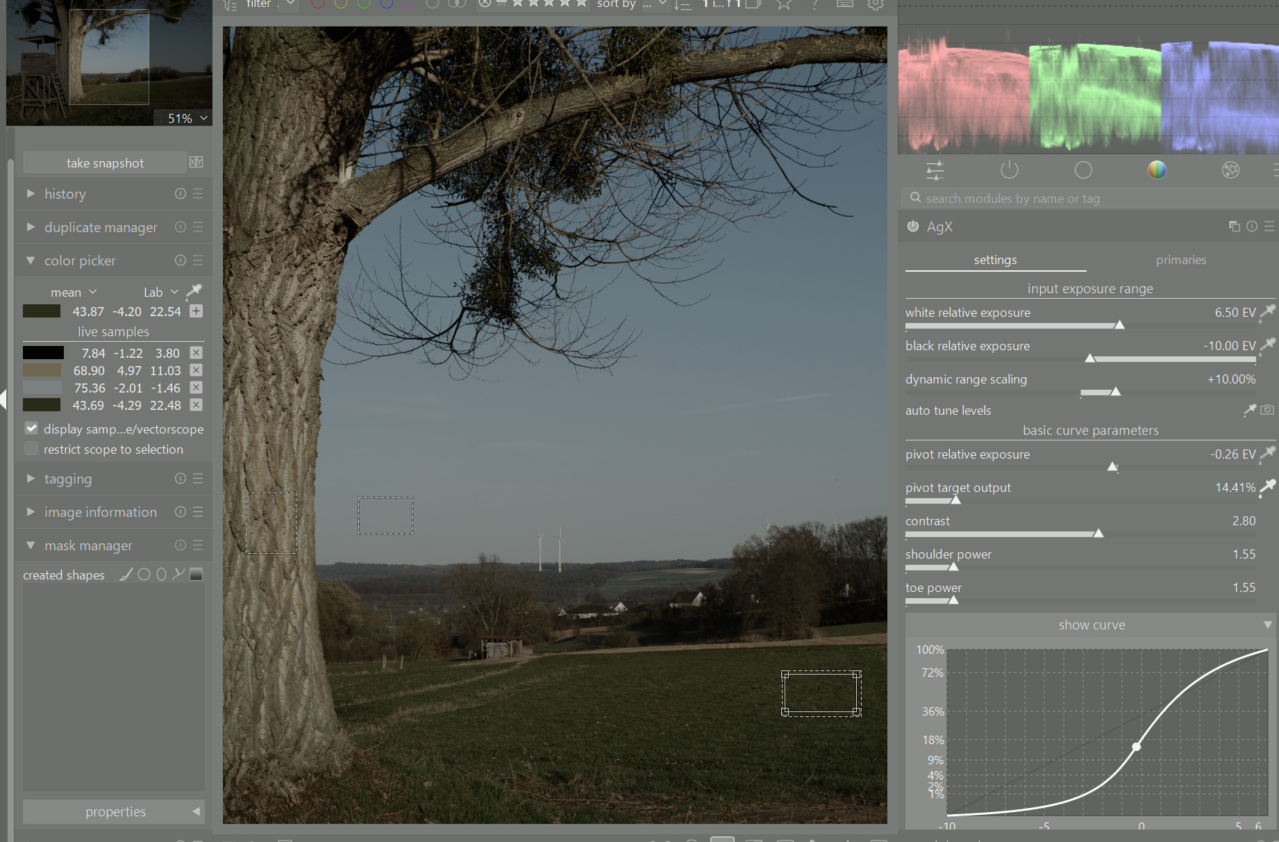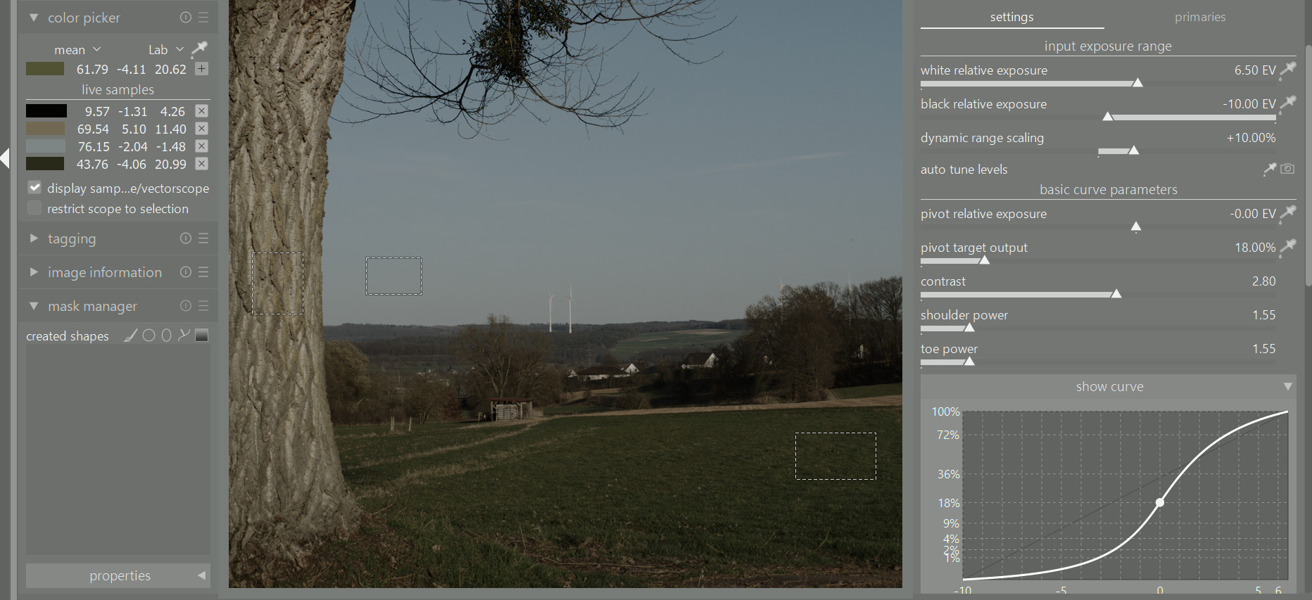 Using the ‘output’ picker, you can shift the point of highest contrast to another part of the image, without changing its brightness. Unfortunately, due to technical limitations (if used for the first time, darktable always sets the picker to cover almost the whole frame), unless the average of the image is initially 18%, you do get a shift the first time you enable it.