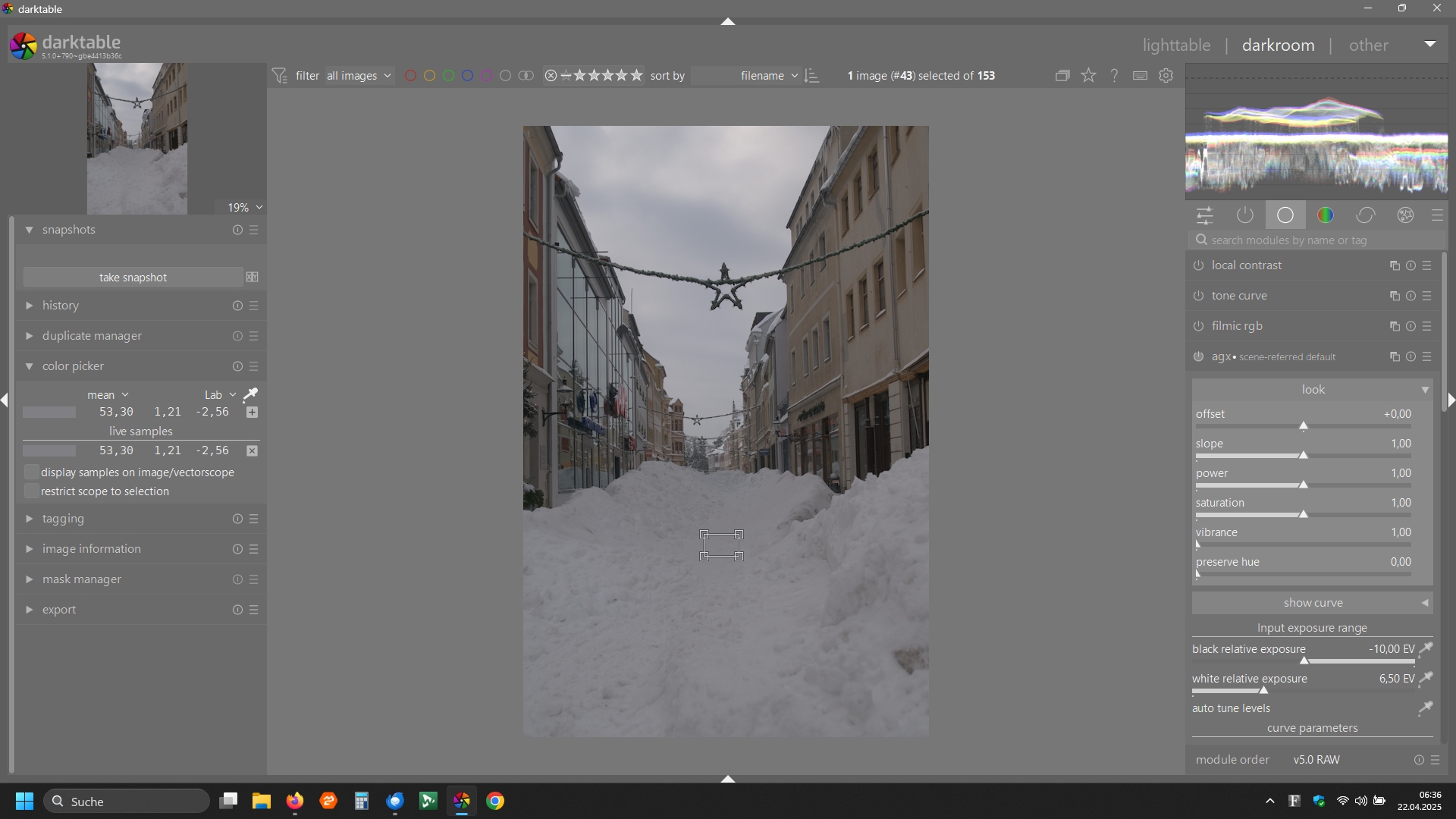 - Vibrance/Saturation: We only need one I guess. I generally prefer the Vibrance control in Colour Balance RGB to the global Saturation one, but otherwise I’m not too worried about either. I do most of my colour work in other modules, so I don’t feel I need it at all in AgX.