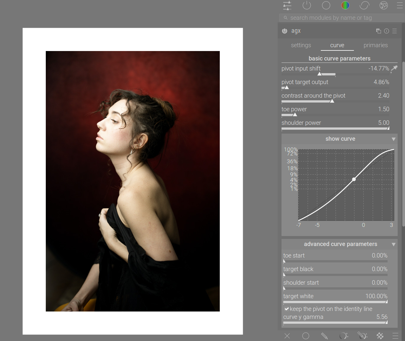 plugins/darkroom/agx/enable_curve_tabvariable indarktablerc. If the variable is set toTRUE, the curve plot and the advanced parameters are removed from the settings tab, and can be accessed via the curve tab, saving vertical space. When set toFALSE, all curve controls appear on the settings tab. The setting is intended to be used with lower-resolution displays, to avoid the need to scroll the module.