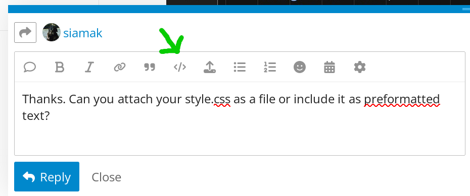 Thanks. Can you attach your style.css as a file or include it as preformatted text? The latter can be done using the symbol with the arrow under the green arrow the attached image.