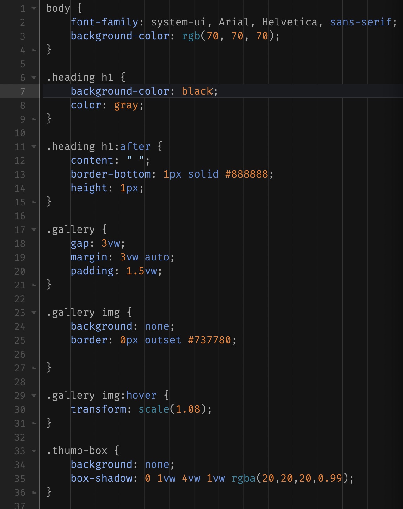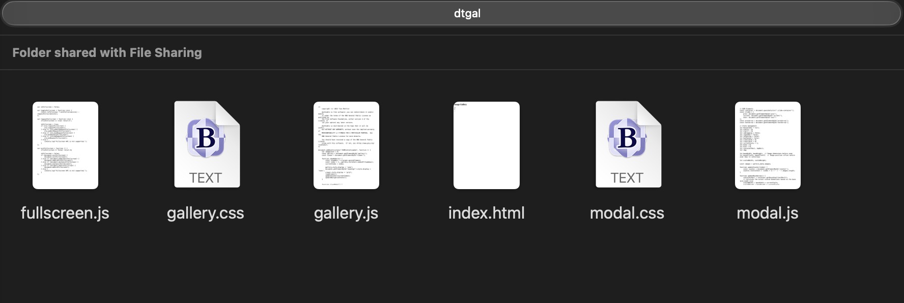 In one of the last changes, I made it easier to adjust the visual style of the gallery (colors, font, frames around the thumbnails etc.). The relevant bits are now in style.css, the functional stuff was left in gallery.css and modal.css. They can be accessed using the link below.