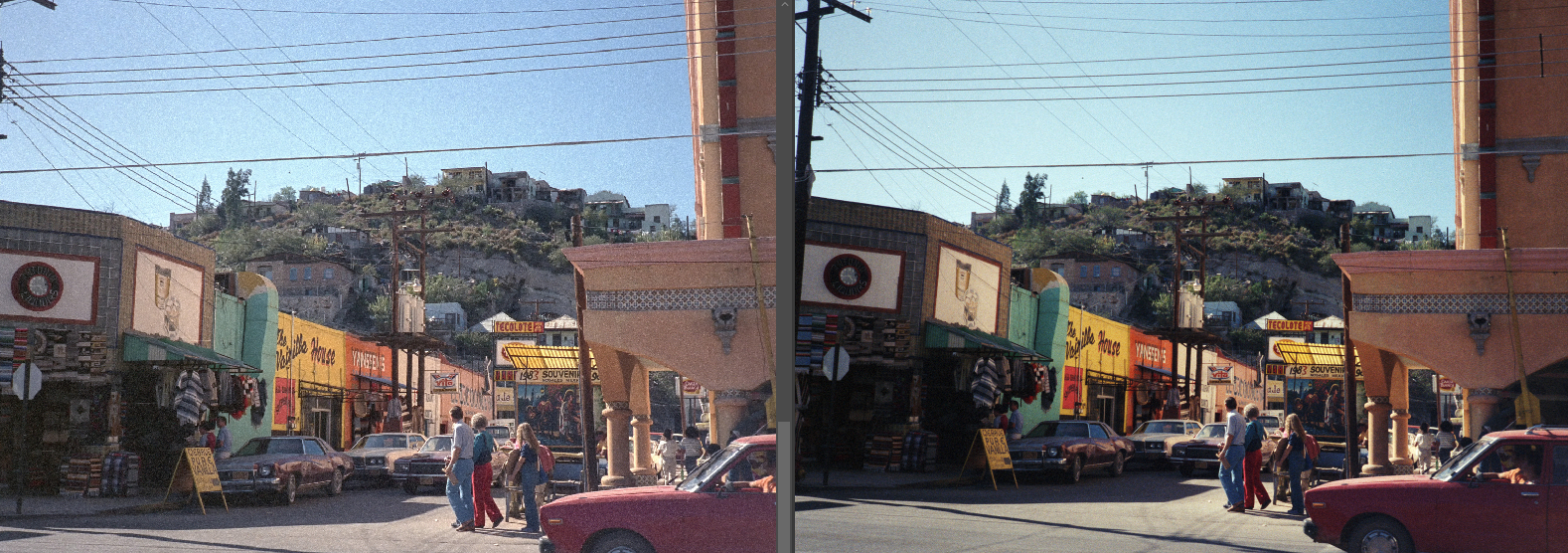 Here is a comparison of the results for a colour negative after my workflow using SilverFast for dust and scratch removal, ColorPerfect for inverting and filtering the orange mask, RawTherapee and Nik collection for optimization (left) and the result of the batch processed image with SilverFast (right).