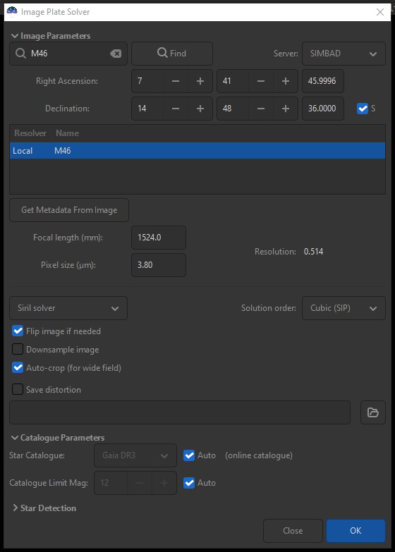 I have not been able to get plate solving to work in Siril V 1.4.0 Beta with Windows 11. I have been using Siril for 3-4 years. I am using a Mallincam DS16C with 0.5 focal reducer on an Orion 8-inch RC 1600mm FL, permanently mounted on an iOptron CEM 60 mount. The attached image shows my try at using Seril Server (I have also tried Astrometry.net) to plate solve my image of M46. The image used is the result.fit file from Siril. I used 2x2 binning. The coordinates agree closely with ones given by TheSkyX. The Plate Solver automatically fills in 1524mm as the FL, which I think is wrong. With 0.5 FR shouldn’t the FL be 800mm? I have tried focal lengths of 1524, 1600, and 800 along with pixel sizes of 3.8, 7.6, and even 15.2 in various combinations all with the same results.