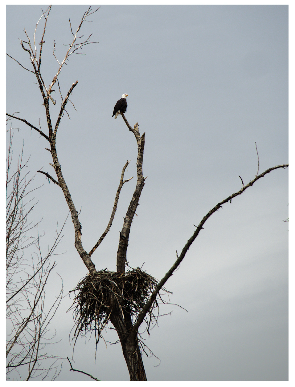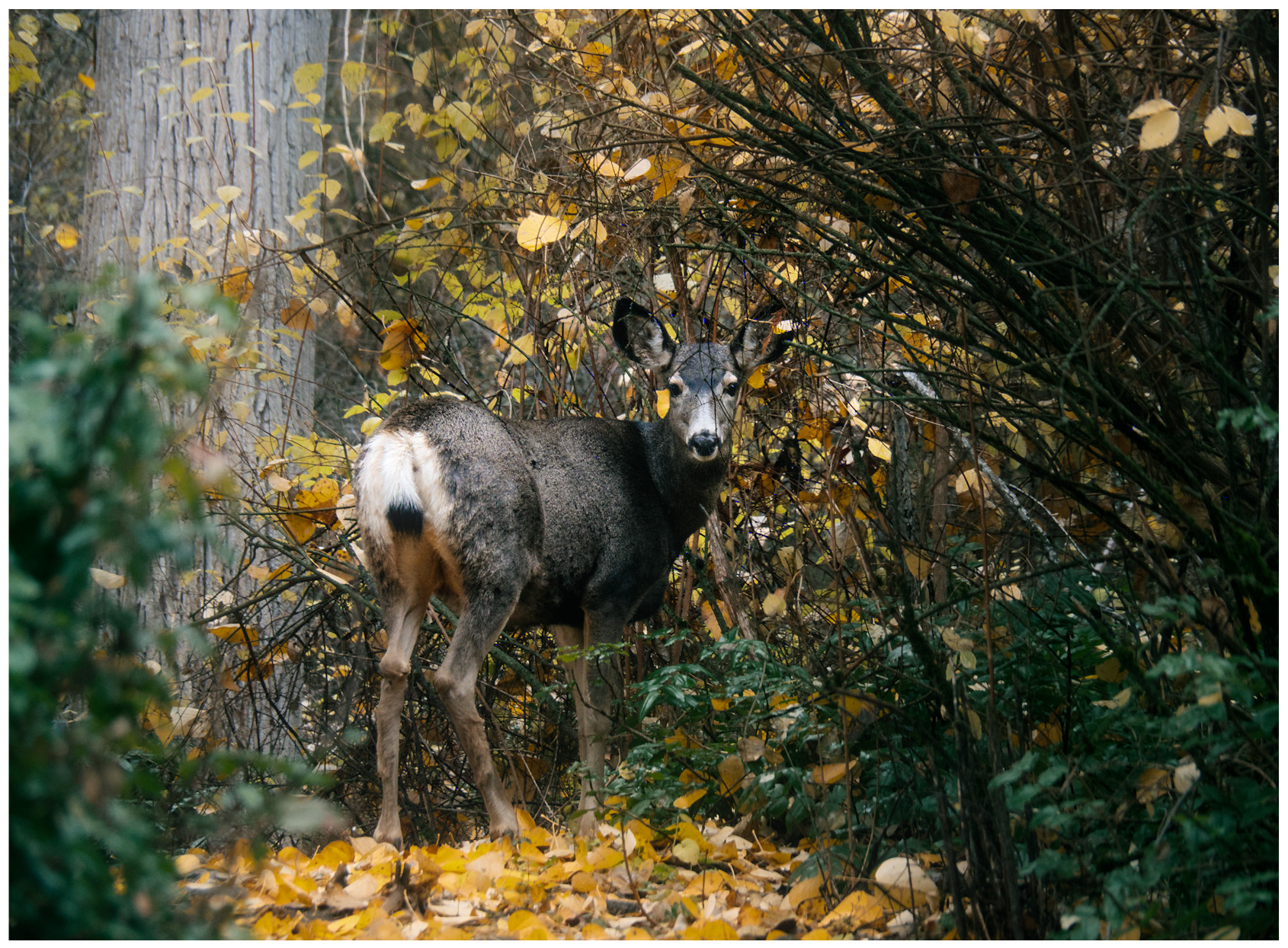 The first snow of winter arrived last night. This was taken off my deck at 240mm equivalent, and then cropped in.