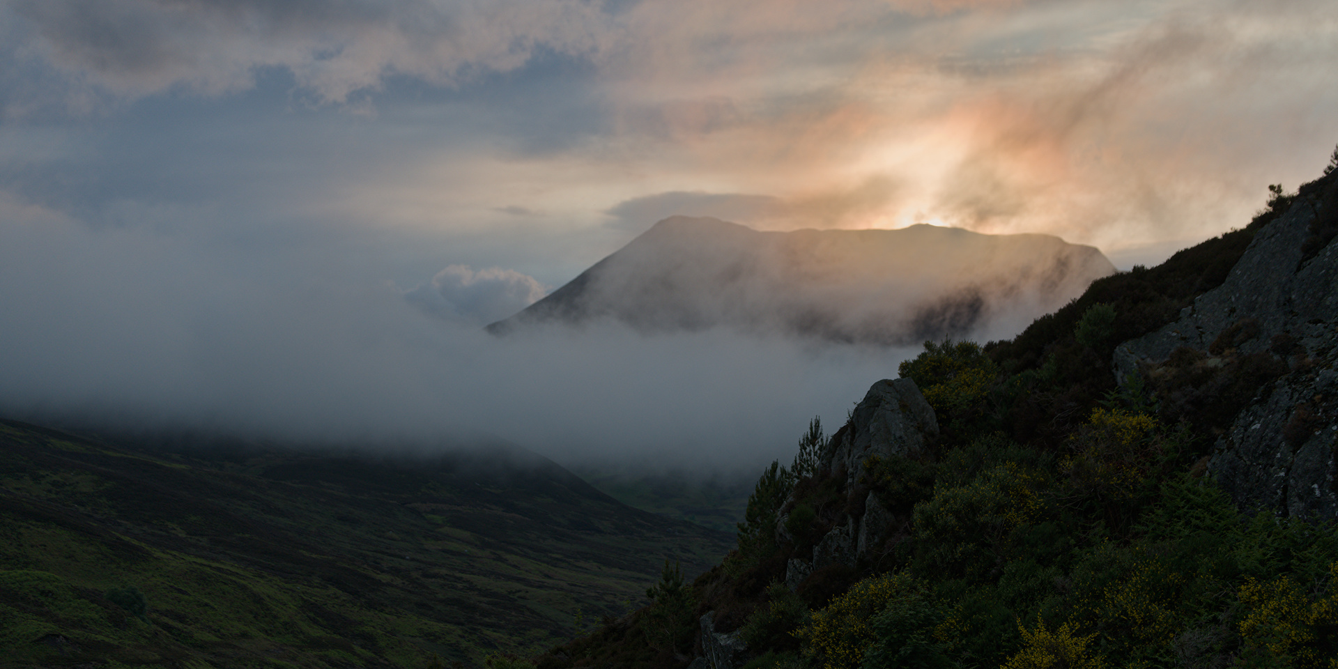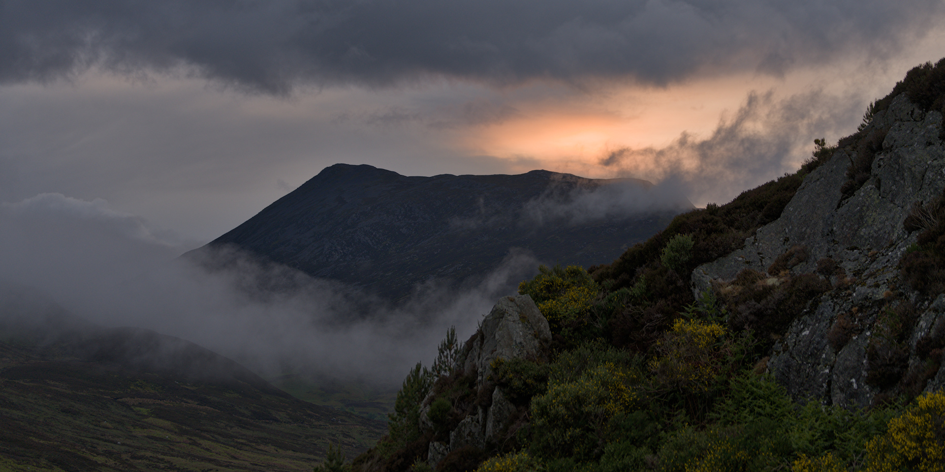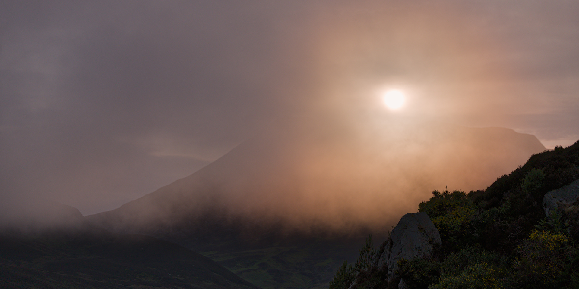 We went to Dun Coillich, looking for badgers. We sat on a grassy heathery knoll for maybe an hour and a half. A badger did pop its head up, noticed us and disappeared again. I had put the camera away at that point (the light was going and getting very grey).