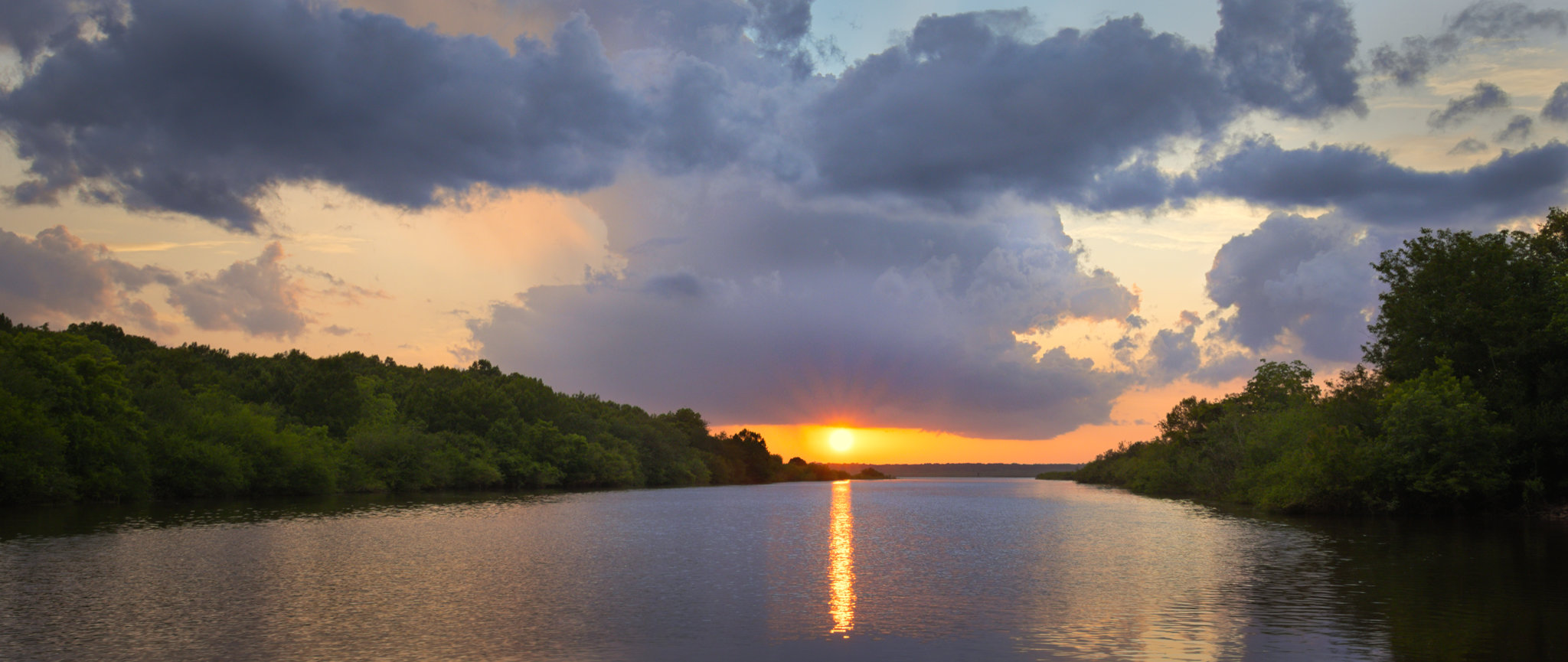 I made a last minute decision to drive out to a local flood-control diversion canal that until just recently had been itself flooded due to rain. I got there 15 minutes before sunset and managed to grab this shot in the window between cloud and lake. Nothing earth-shattering but I like the sun in that horizontal “slot”. I also like the cool blue and warm orange contrasting colors.