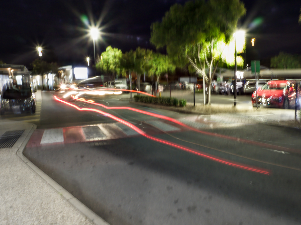 Winter solstice here in the Southern Hemisphere … 6 second hand-held whilst waiting for takeaway order at the local fish shop. My favourite of 6 captures due to the red light-trails.