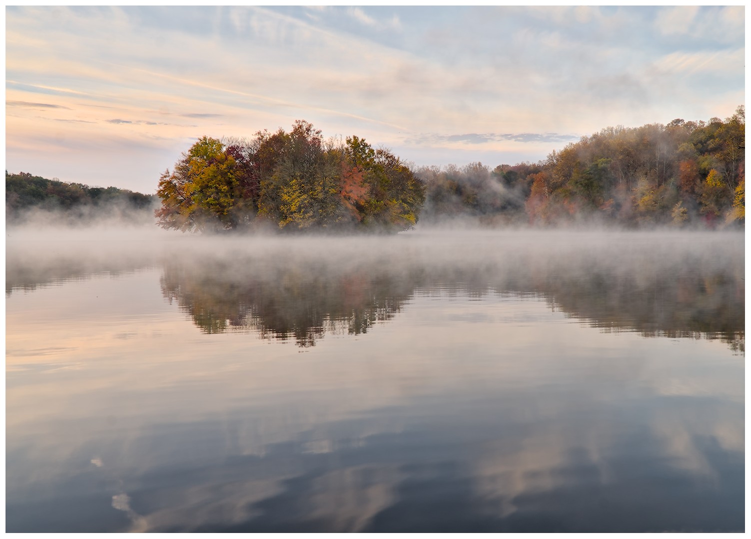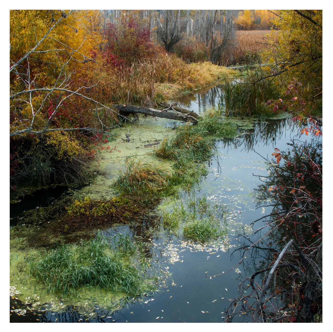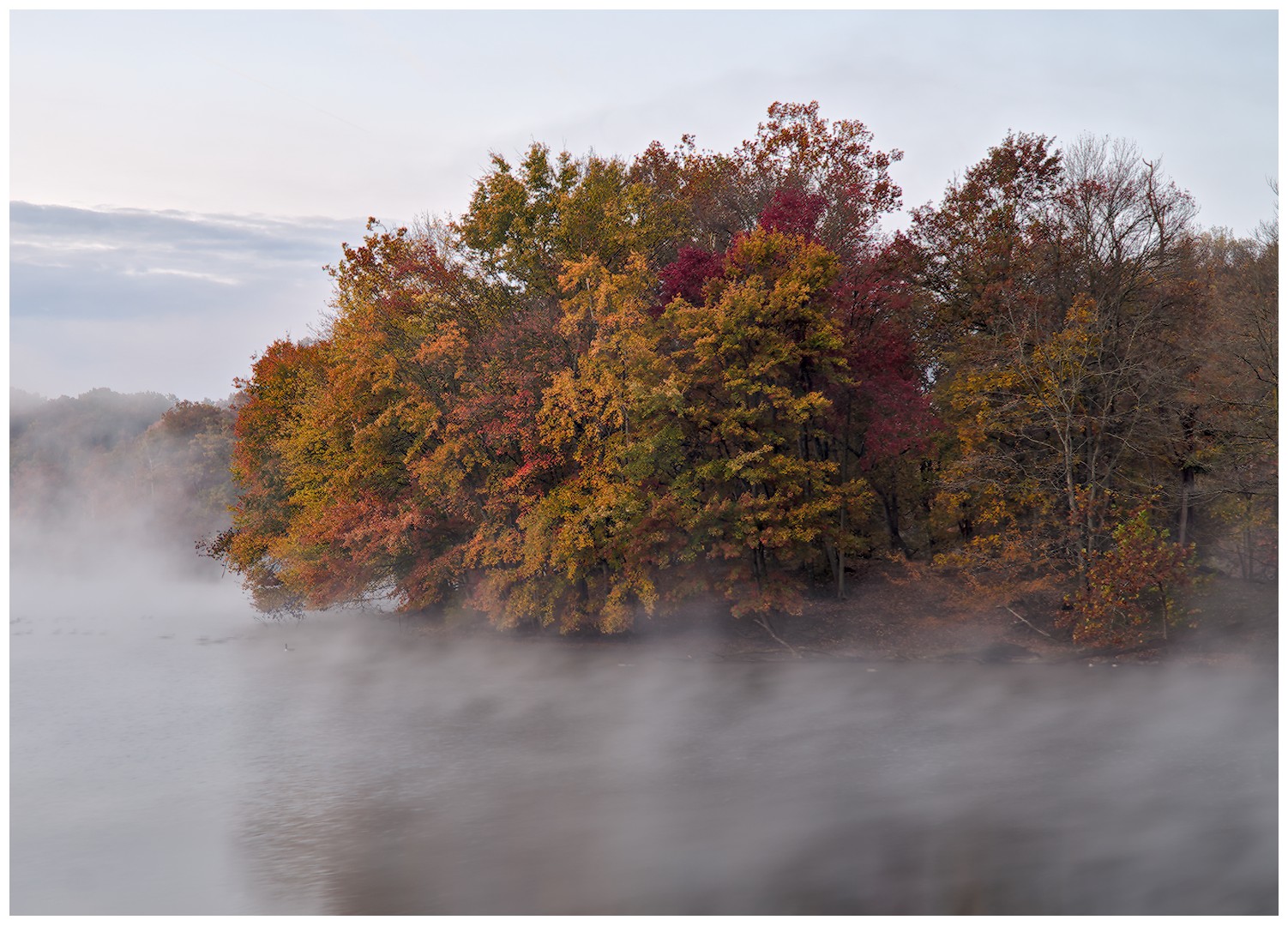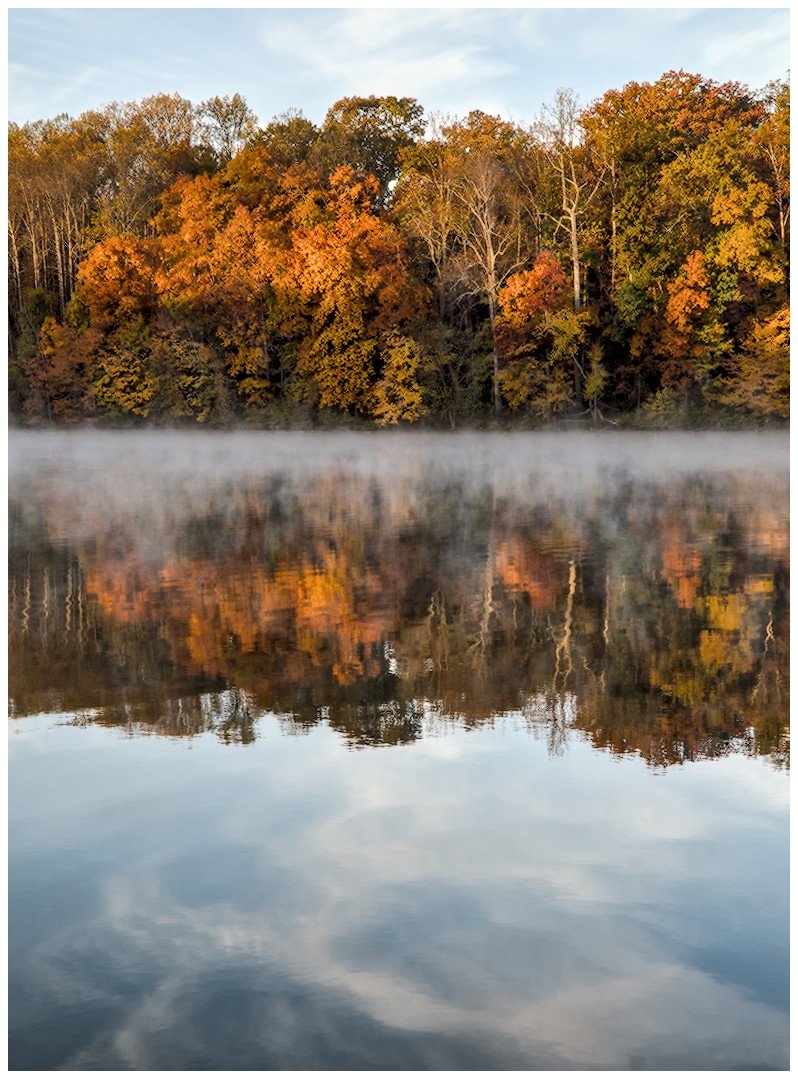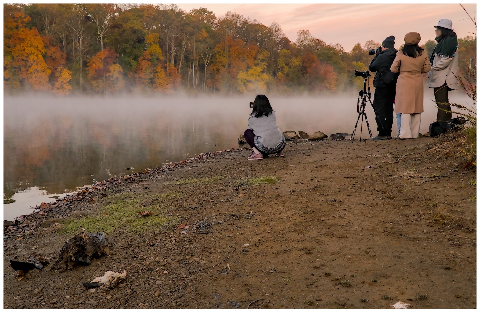 I wanted to come back to the carrion and contrapose it with the first rays of sun hitting the fall leaves. Unfortunately, someone used a stick to flip it into the water after framing up a shot across the lake. I assume it was to get the dead bird out of his foreground.