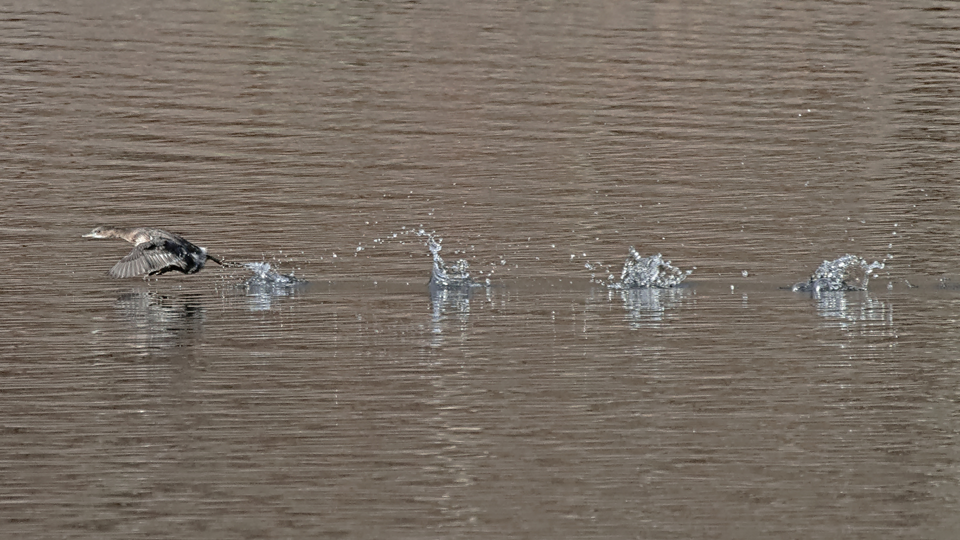 A little grebe running on the water