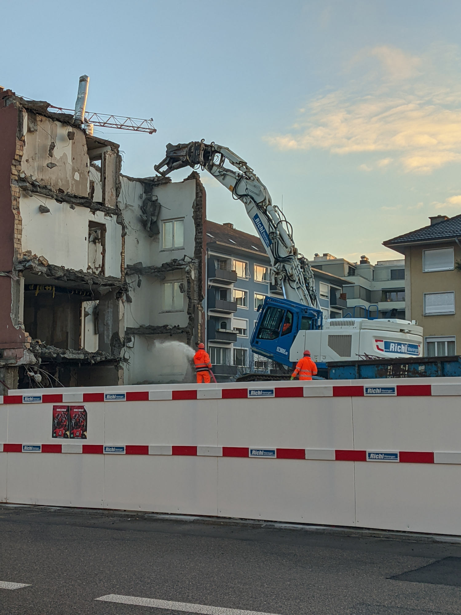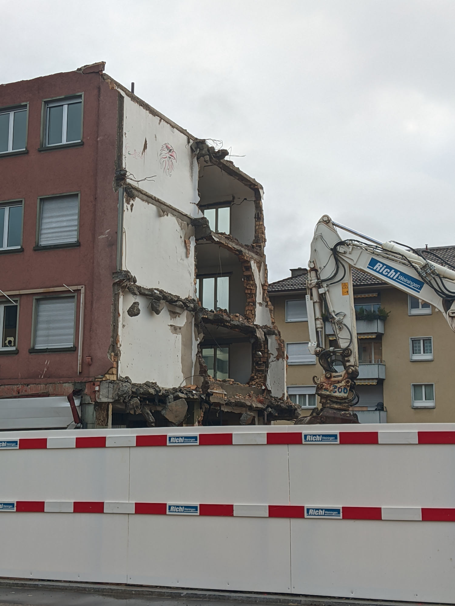 Lots of older buildings are torn down in our area to make space for newer, larger ones. This one caught my eye because it was very sad to see that someone’s former room (could be a child’s room, given the mural) was so exposed and destroyed, the bird being the only reminder now, ‘facing the beast’ coming for it, without a chance.