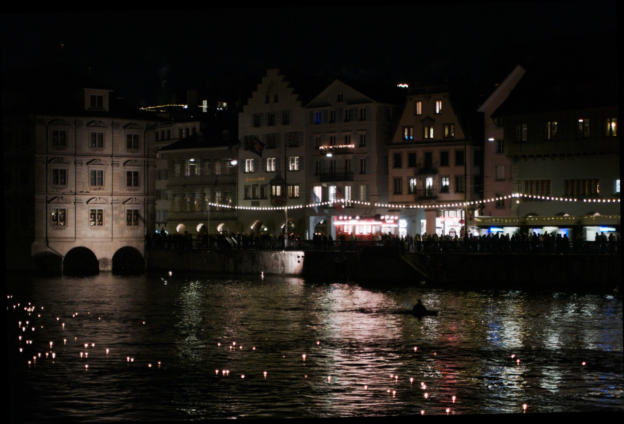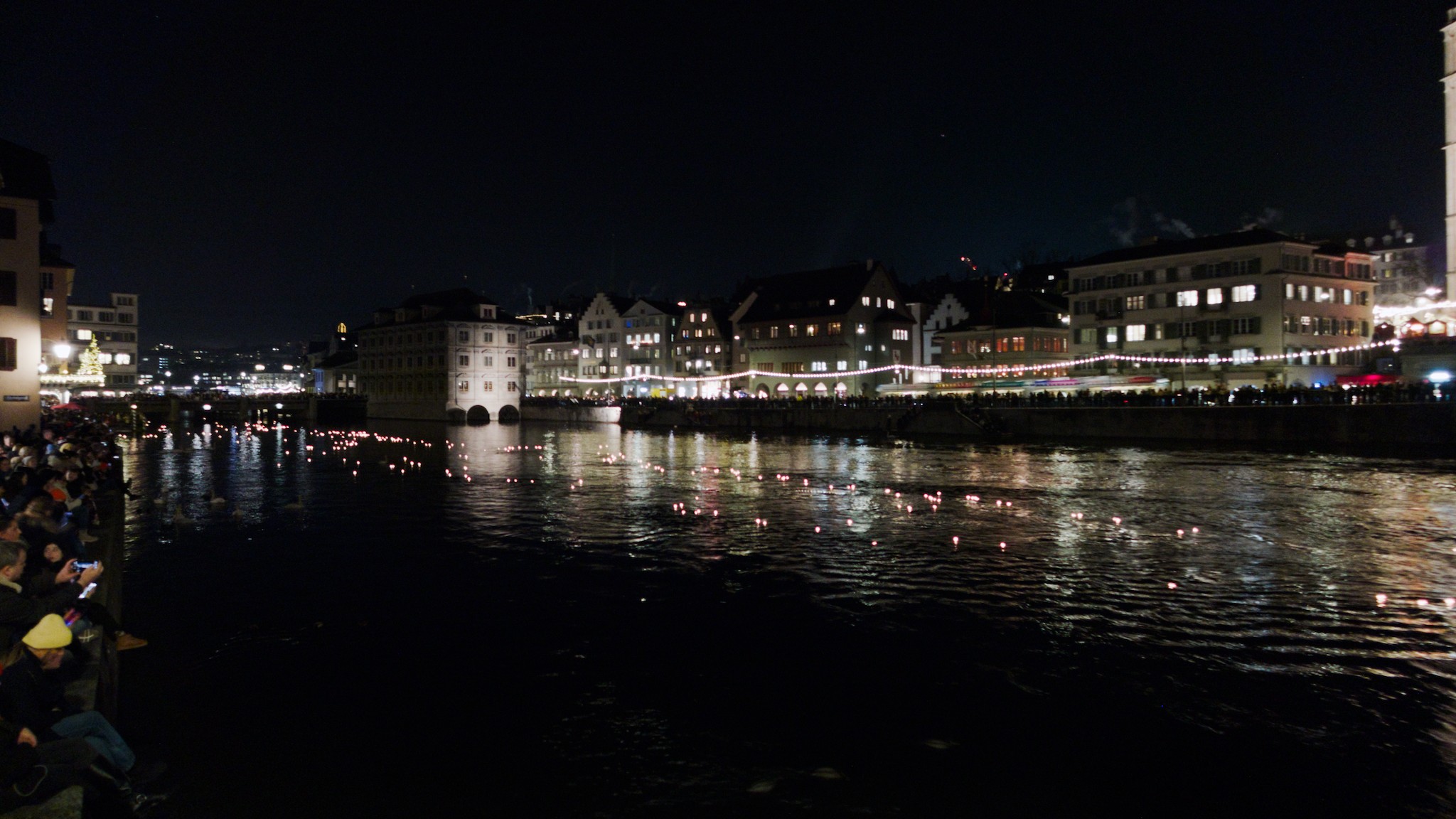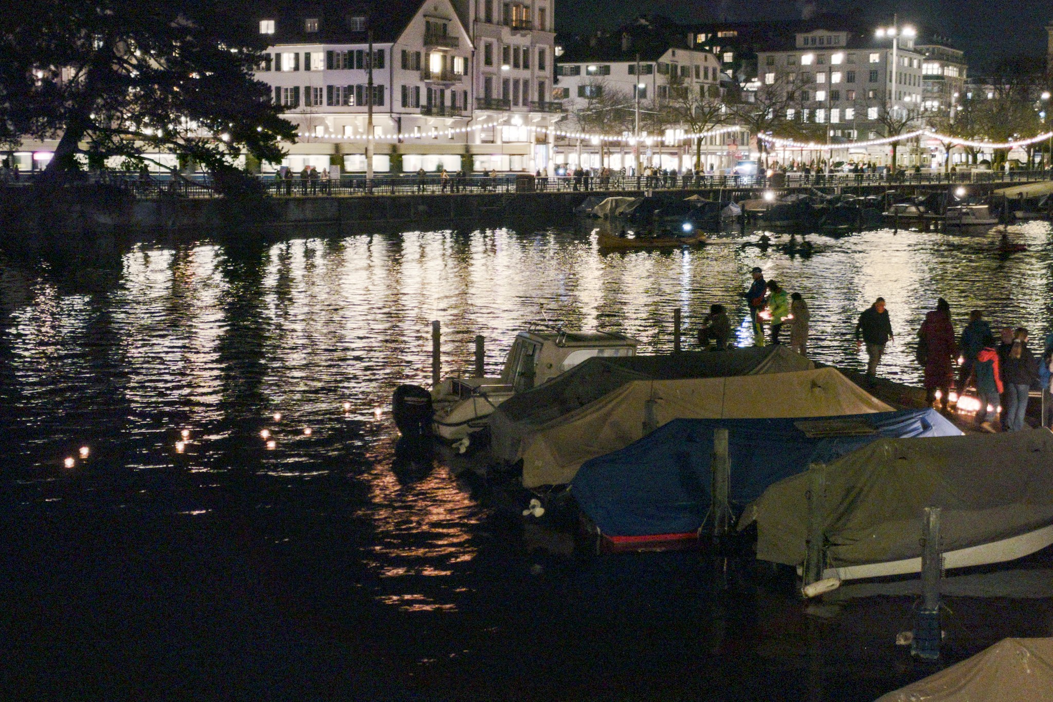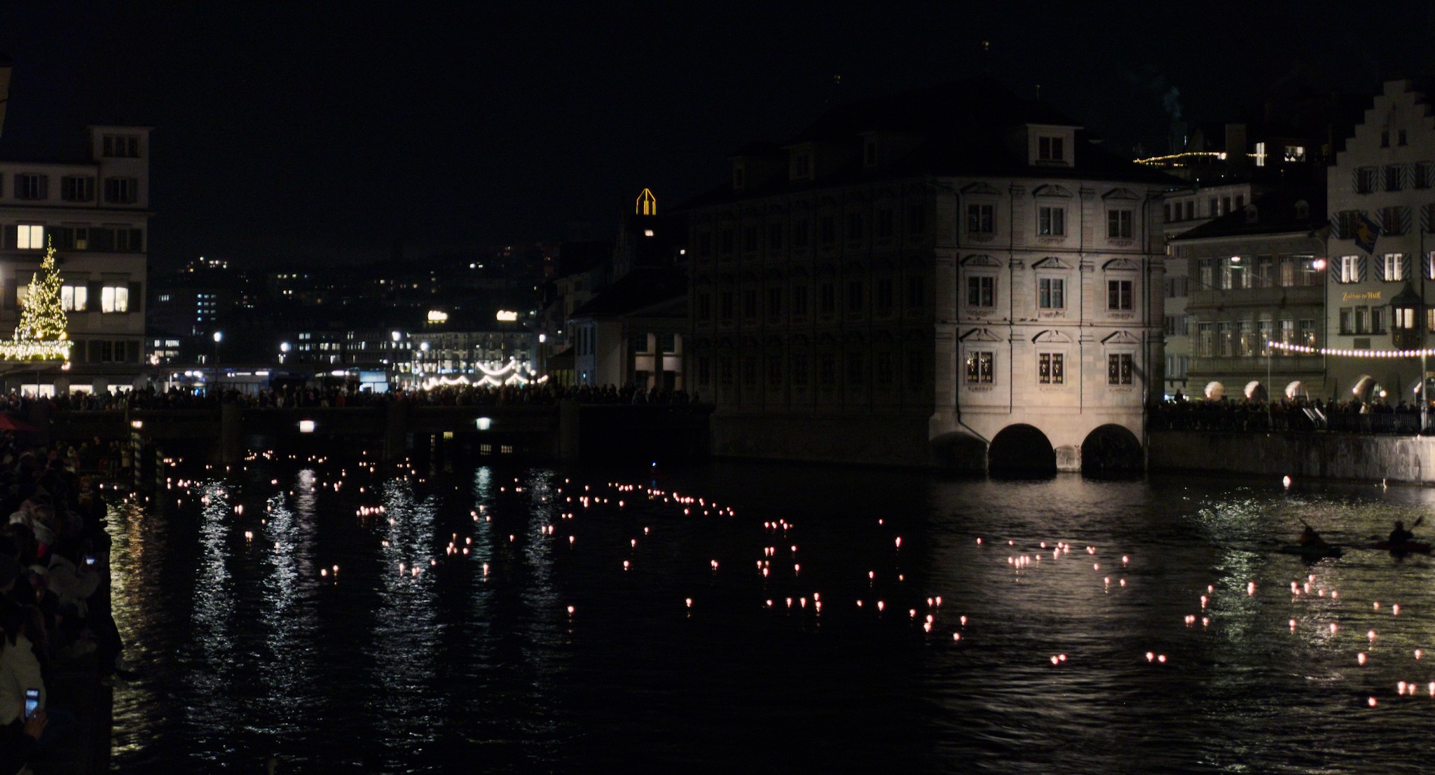 It’s a tradition started in 1962, when 5th and 6th graders float small candles (900 of them, this year) down the Limmat. We were already on the river bank, when we found out that we know one of the organisers (the couple working as janitors for the school). The red rectangle in the background of the 3rd shot it the Märlitram, driven by Santa himself, with angels being the ticket inspectors.