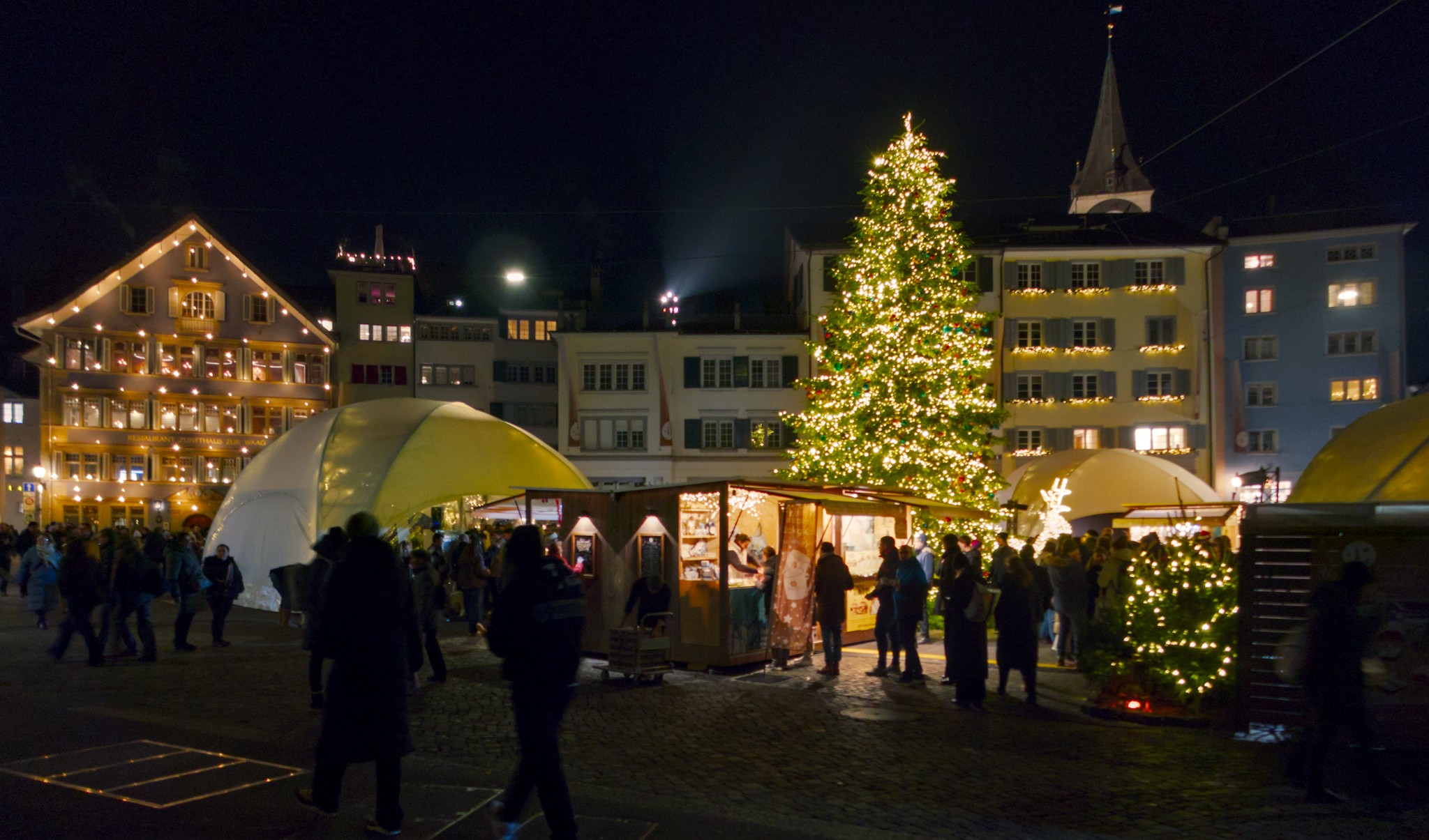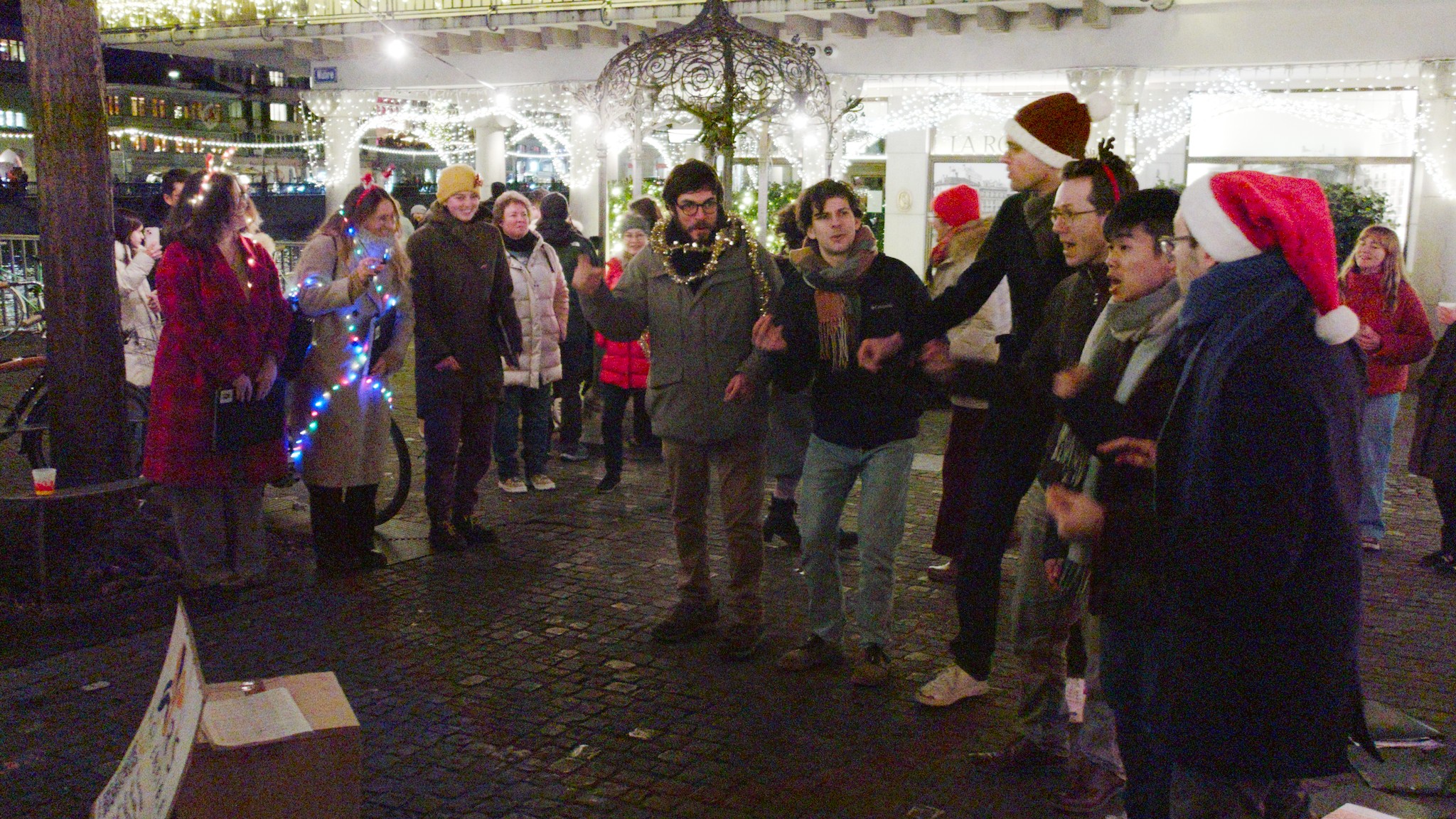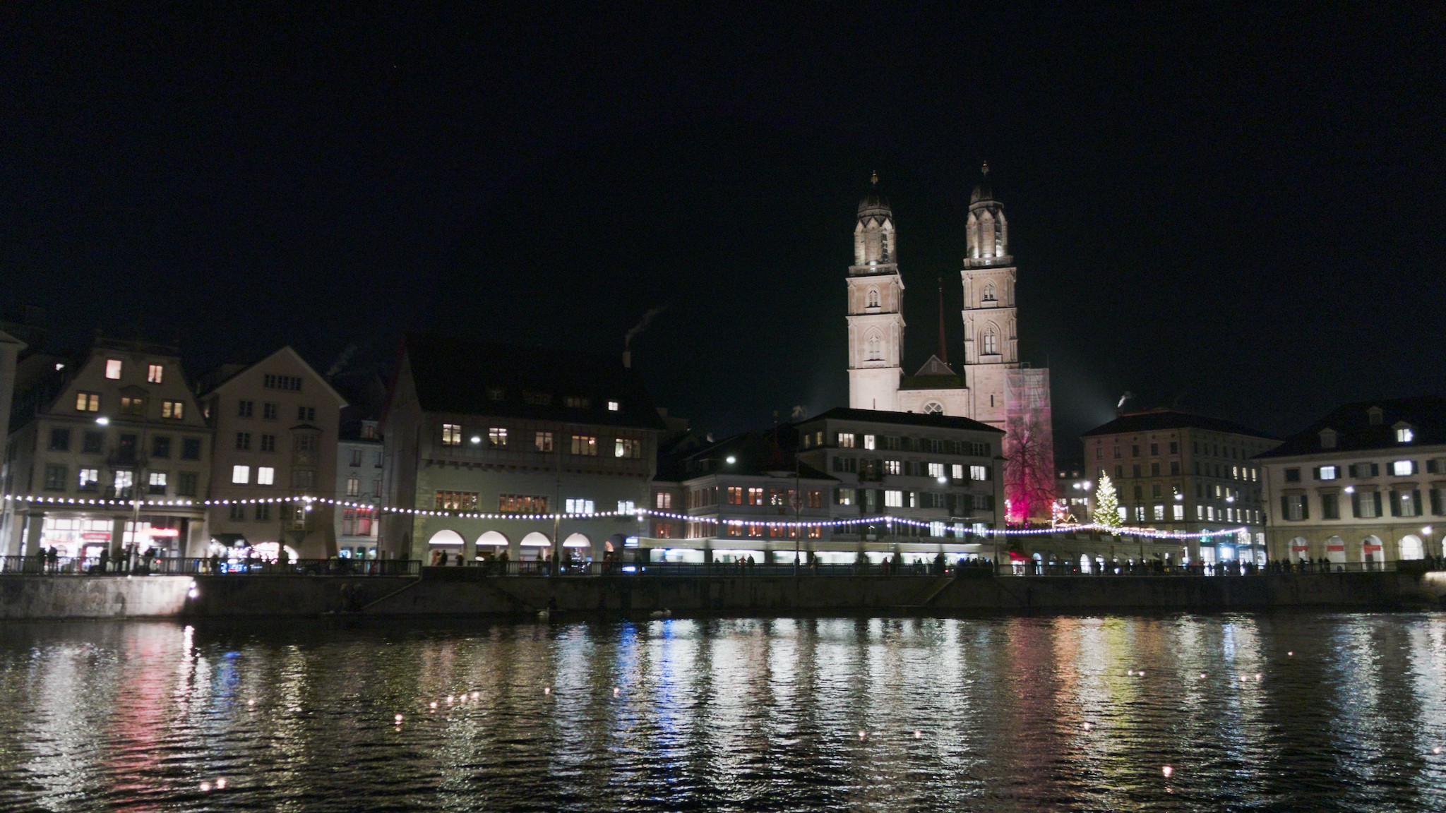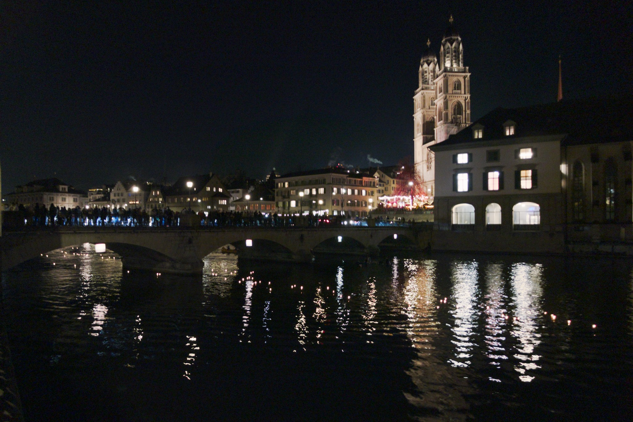 It’s a tradition started in 1962, when 5th and 6th graders float small candles (900 of them, this year) down the Limmat. We were already on the river bank, when we found out that we know one of the organisers (the couple working as janitors for the school). The red rectangle in the background of the 3rd shot it the Märlitram, driven by Santa himself, with angels being the ticket inspectors.