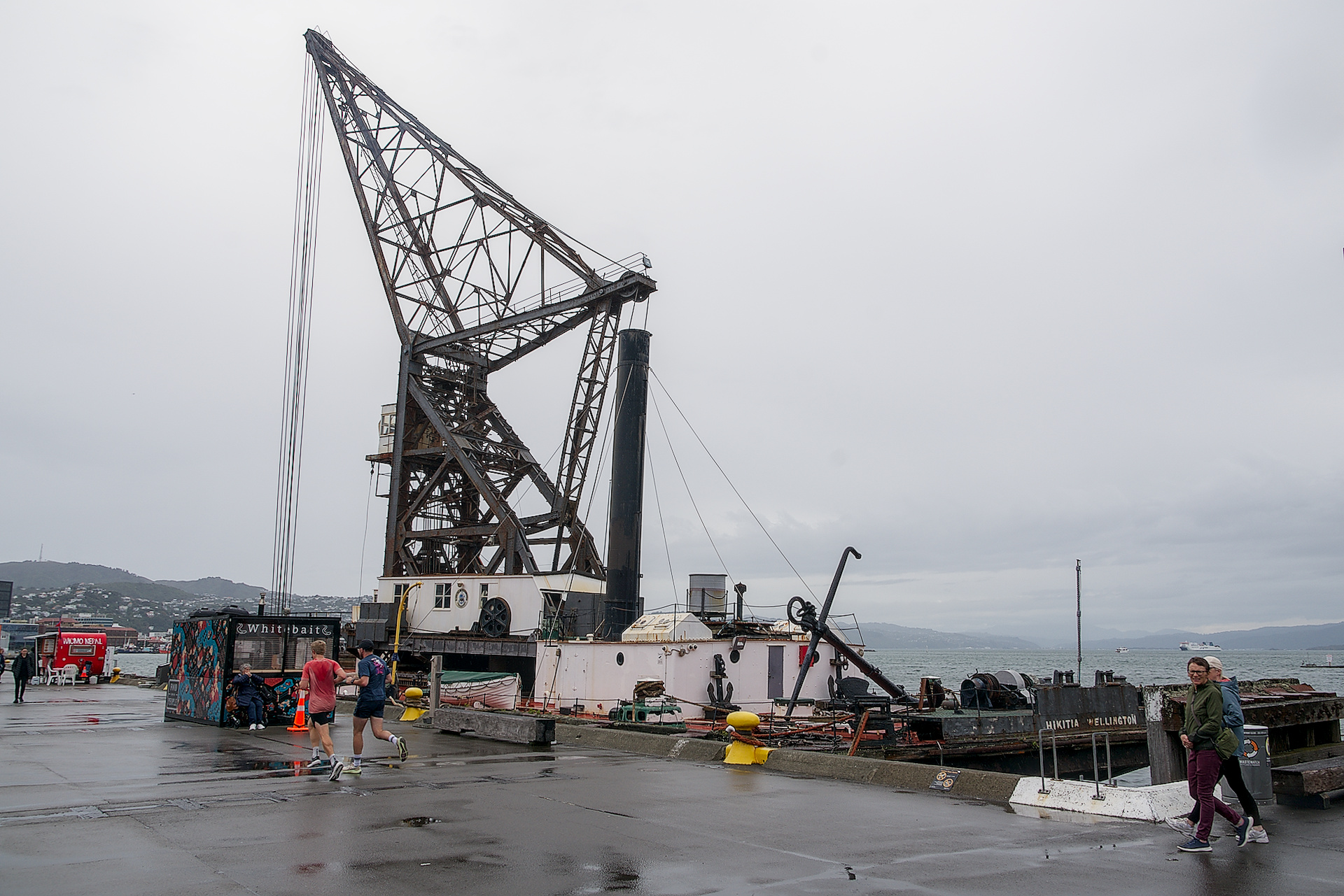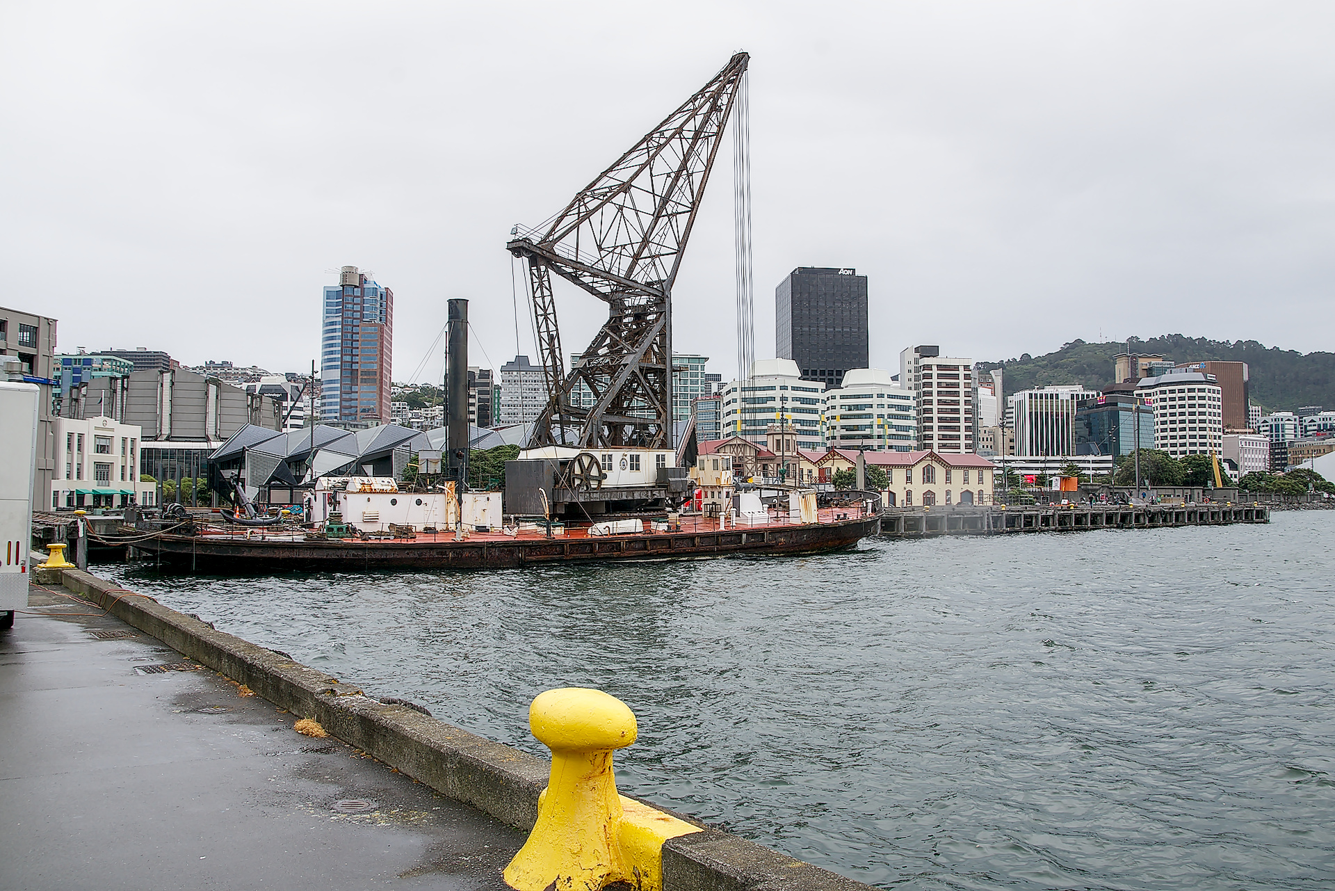 Three images of the Hikitia - a steam-powered floating crane in Wellington, NZ, on a grey day.