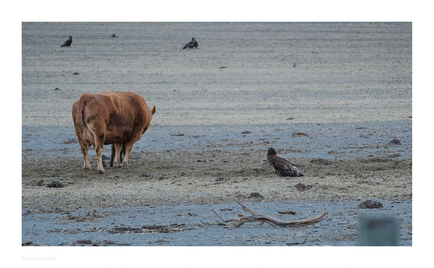 They wait for the placenta, Iâve heard. So with all of the calving activity happening itâs quite common to see small groups of raptors hanging out amongst the cows. I had hoped for the calf to come more in to the frame, but mother cow was still cleaning the little one off.