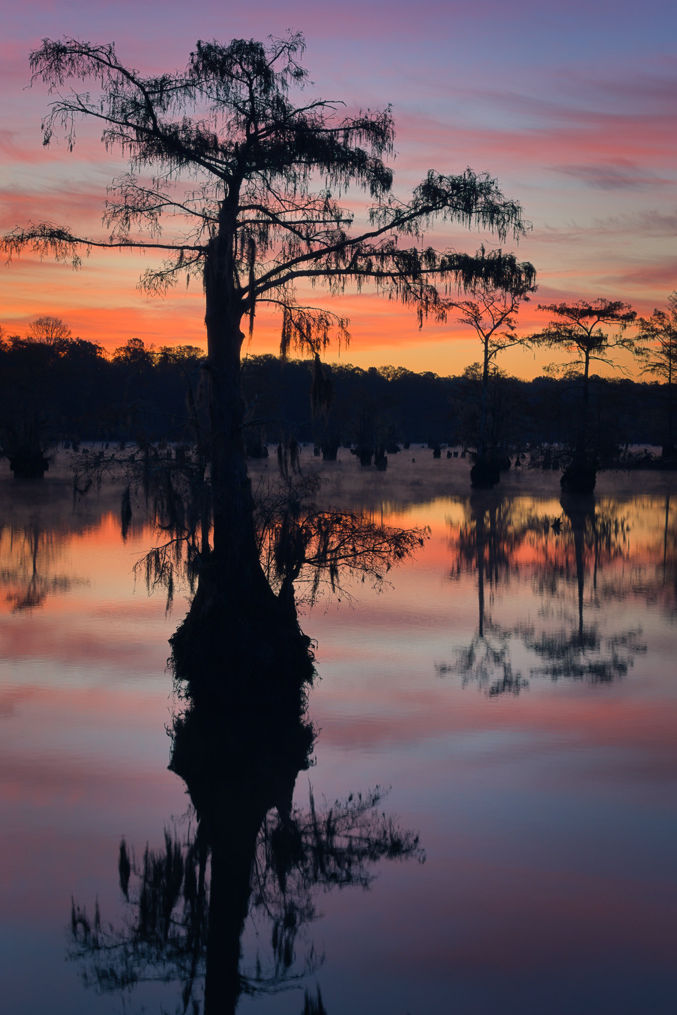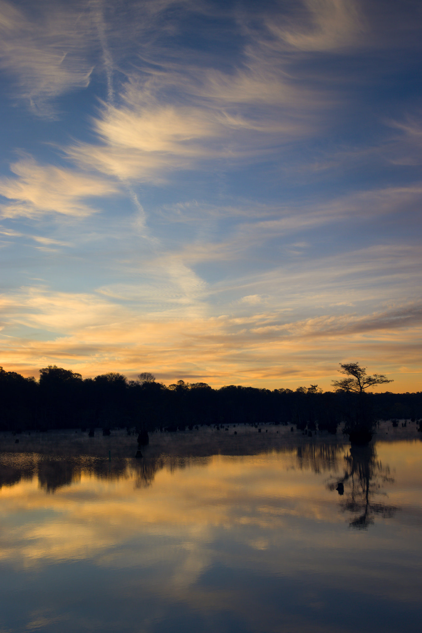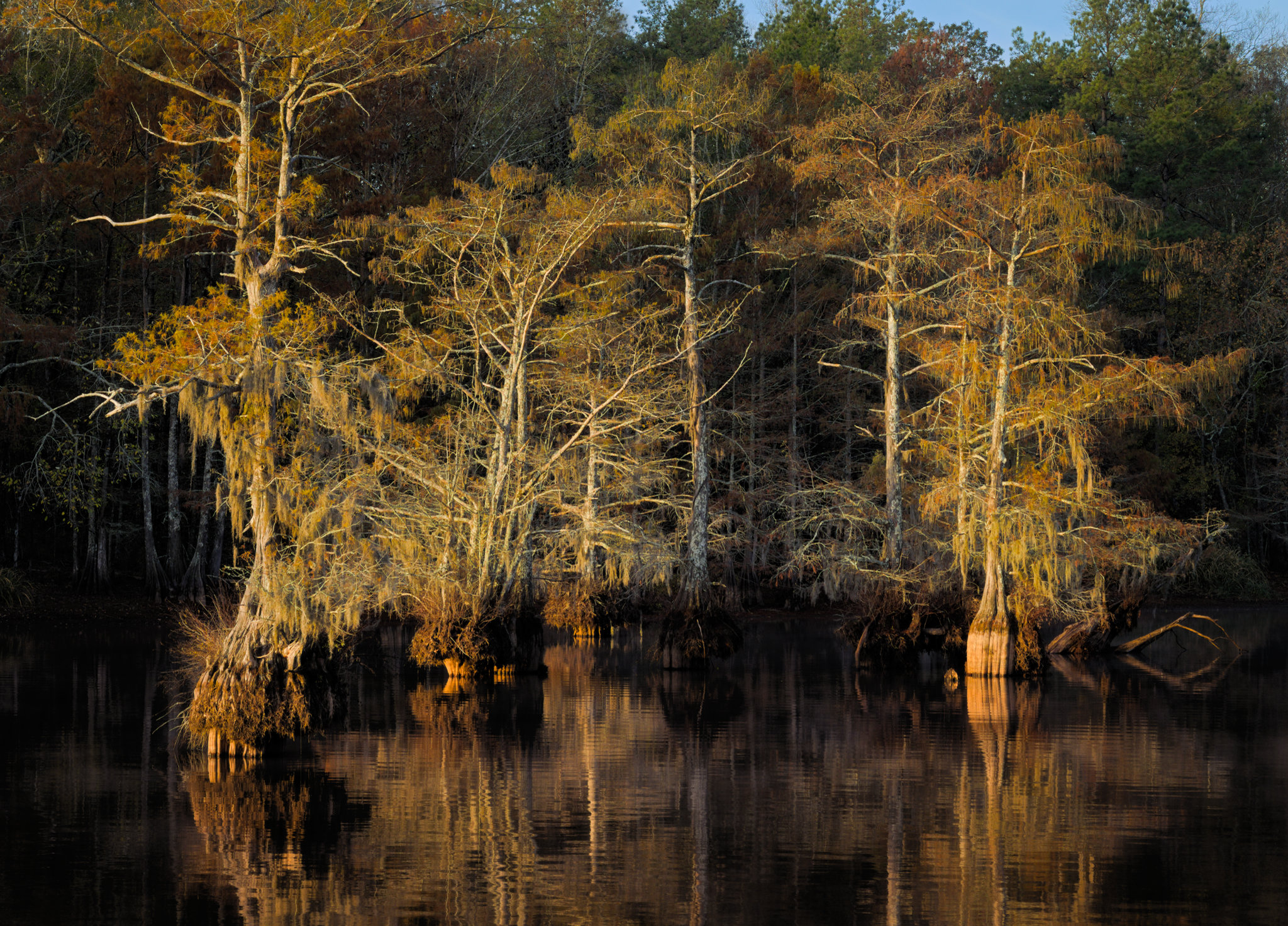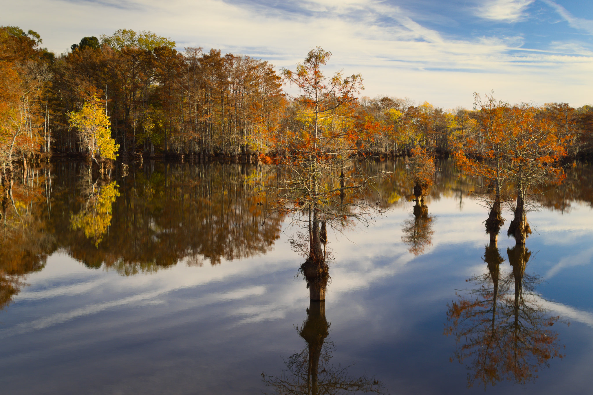 Another early rise, hour drive each way and for what? To shoot a few bare cypress trees silhouetted against the sunrise sky. Iâm getting desperate! I was hoping some fall color was left and there a little here and there. However, to get much flexibility in composition at a cypress lake, you need to be in a boat. I think Iâve already basically exhausted the vantage points and major compositions at this lake (although of course light and atmosphere are infinite). I hope to be proven wrongâŚ