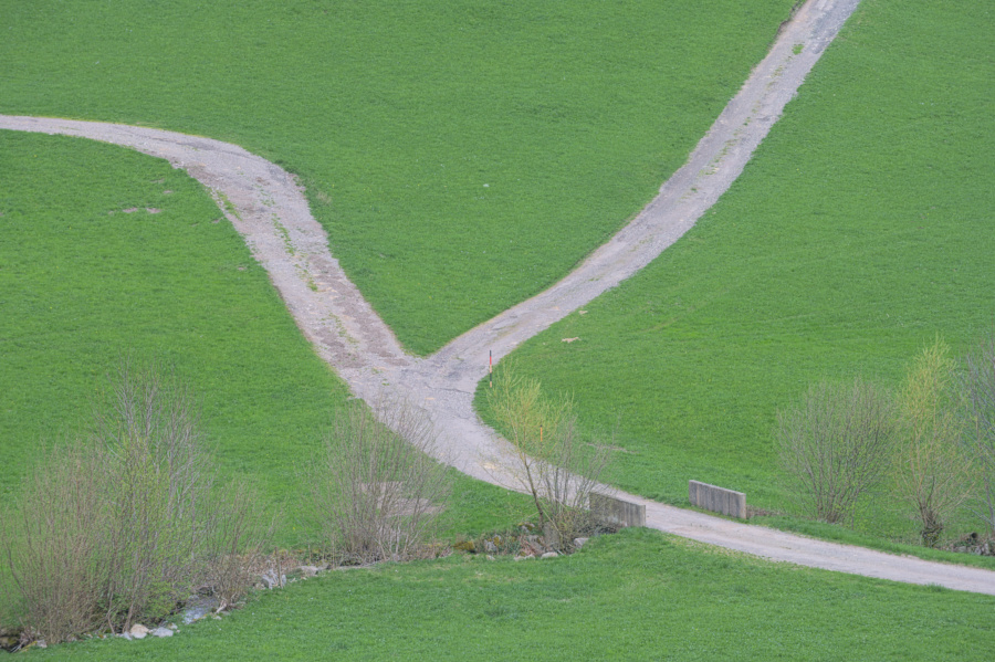 A metaphor of Joe the Photographer looking at the Canon and Nikon displays at the local camera shop.