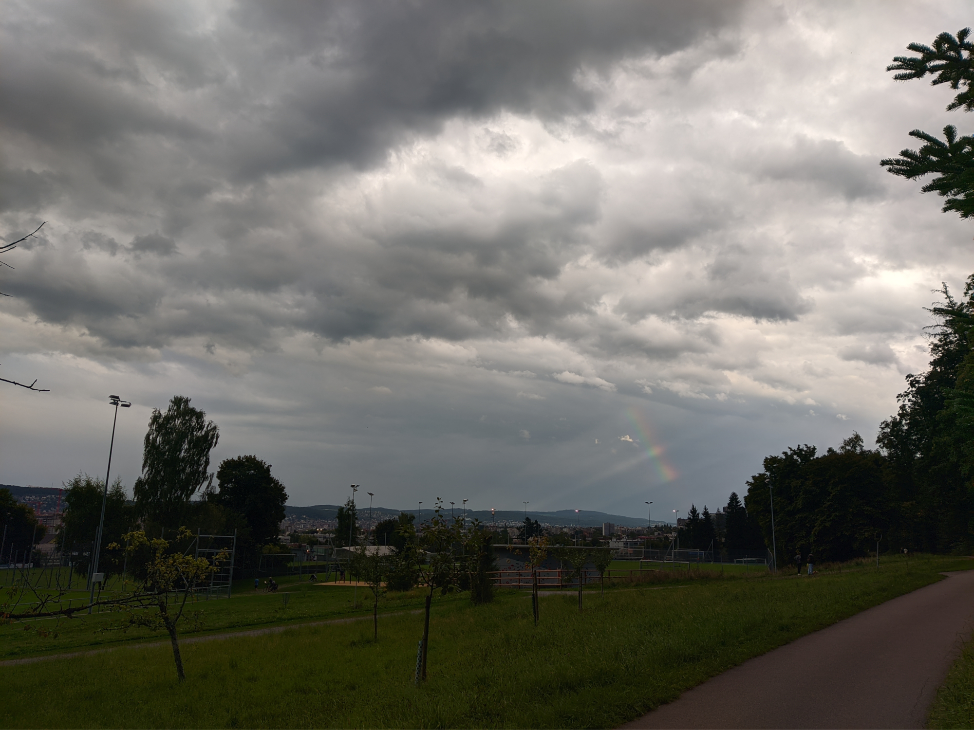A weird rainbow, snapped with the phone. On the right is west; the Sun is setting behind a row of trees at the foot of Uetliberg.